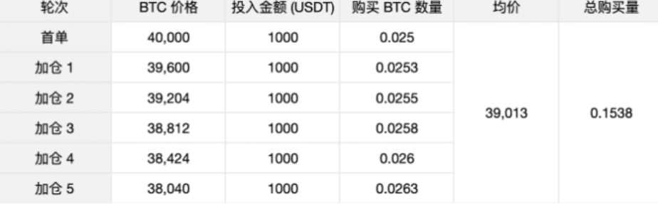 但用 DCA 策略机器人定投,设置 “跌 1% 加仓一次,最多加 5 次,每次投 1000 USDT”,最终:BTC 定投均价 =(40000+39600+39204+38812+38424+38040)/6=39013 USDT比一次性买多拿了 0.0038 枚 BTC,均价还低了近 1000 刀!全程程序自动执行,不用你盯盘心慌。