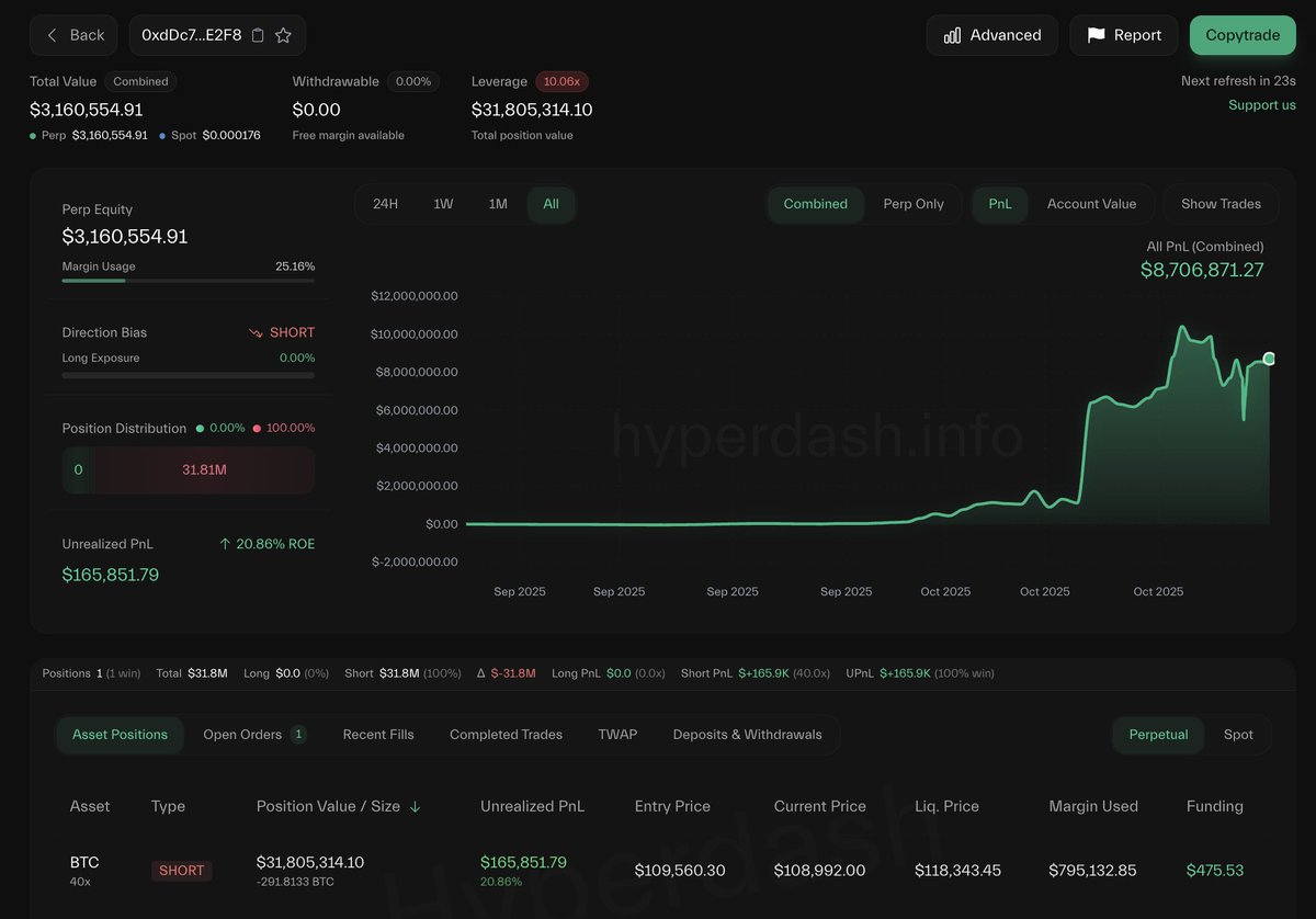 Smart trader 0xdDc7 (80% win rate, $8.7M total profit) just deposited 3M $USDC to #Hyperliquid an hour ago and opened a 40x short on 291 $BTC($31.8M).