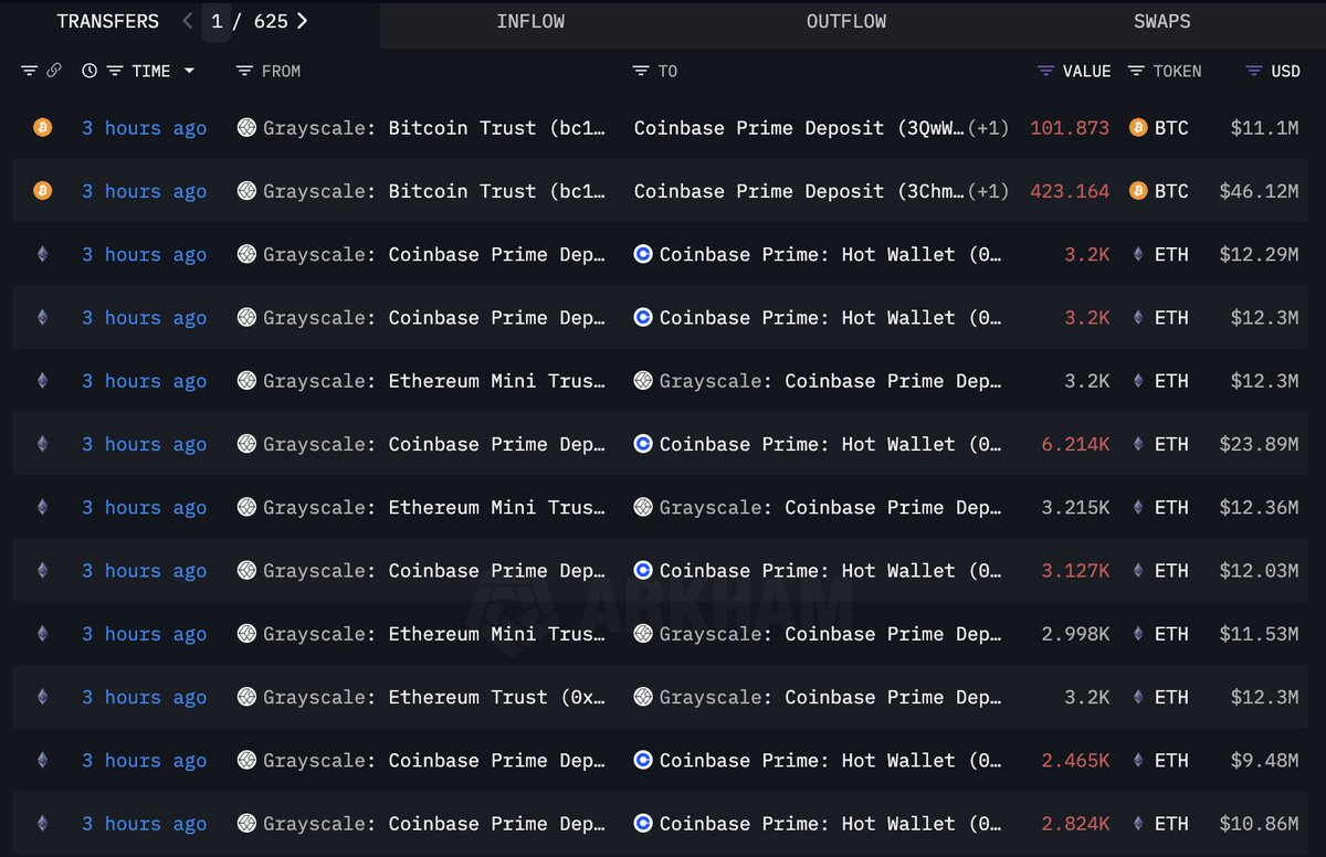 Grayscale deposited 525 $BTC($57.22M) and 21,030 $ETH($80.84M) to #CoinbasePrime 3 hours ago.
