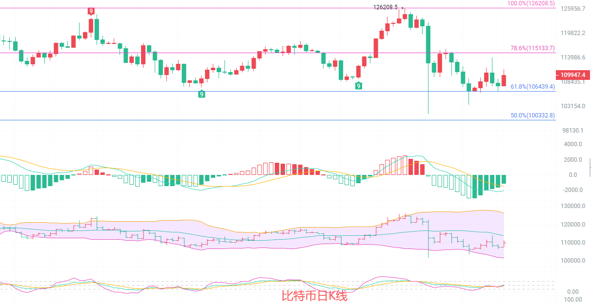 日K线发稿前最高111240,最低107460,EMA趋势指标向下交替扩散的趋势依旧,也就是空势延续,短线回调,试探趋势指标的压强大不大,MACD出现了底部背离的行情,有很大概率行情还要冲一波前高,布林带下压中轨已经跌倒了114000,下轨来到了101600,思路上高位南下不变