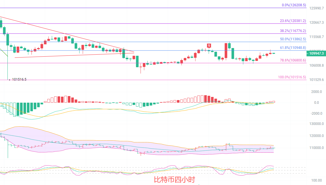 四小时K线受阻黄金分割线0.618阻力111000回落,目前在11万关口横盘,下方支撑弱一些空间要比上方大,MACD连续放量增筹,上轨压力位关注112100,消息面利好已经提前释放了,预支结果的利好消息已经不能算利好了,所以还是理性一些回归正题,只要做到在关键的点位布局,带好止损就可以了错了就止损离场,对了空间很大