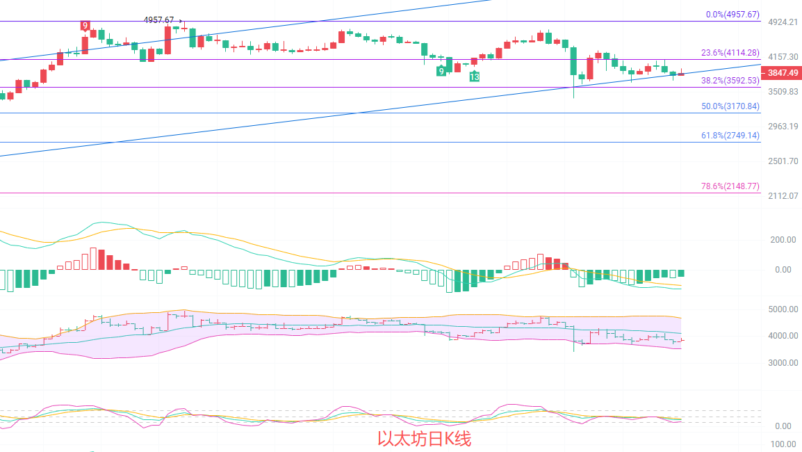四小时K线受阻0.618一线3917,和 EMA60趋势阻力3950,回落到了趋势指标下方,MACD出现底部背离,DIF和DEA形成的死叉被扳回,布林带向下回落,多空开始收缩,上轨来到了4025,下轨关注3750,思路上高位南下有效,第一入场点在3900附近,第二入场点4000上方遇阻力就可以继续南下