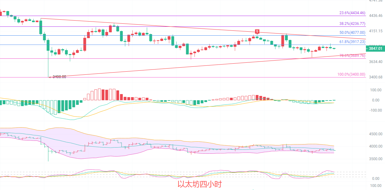 日K线发稿前最高3933,最低3794,现在的日线处于一个下降的三角收缩的行情,上方第一阻力点就是EMA120趋势线3870,第二位就是3933,MACD出现底部背离的行情,DIF和DEA依旧在向下扩散,空势延续,布林带下行通道箱体有效,中轨关注4100,下轨关注3530,整体趋势上依旧偏向于南下