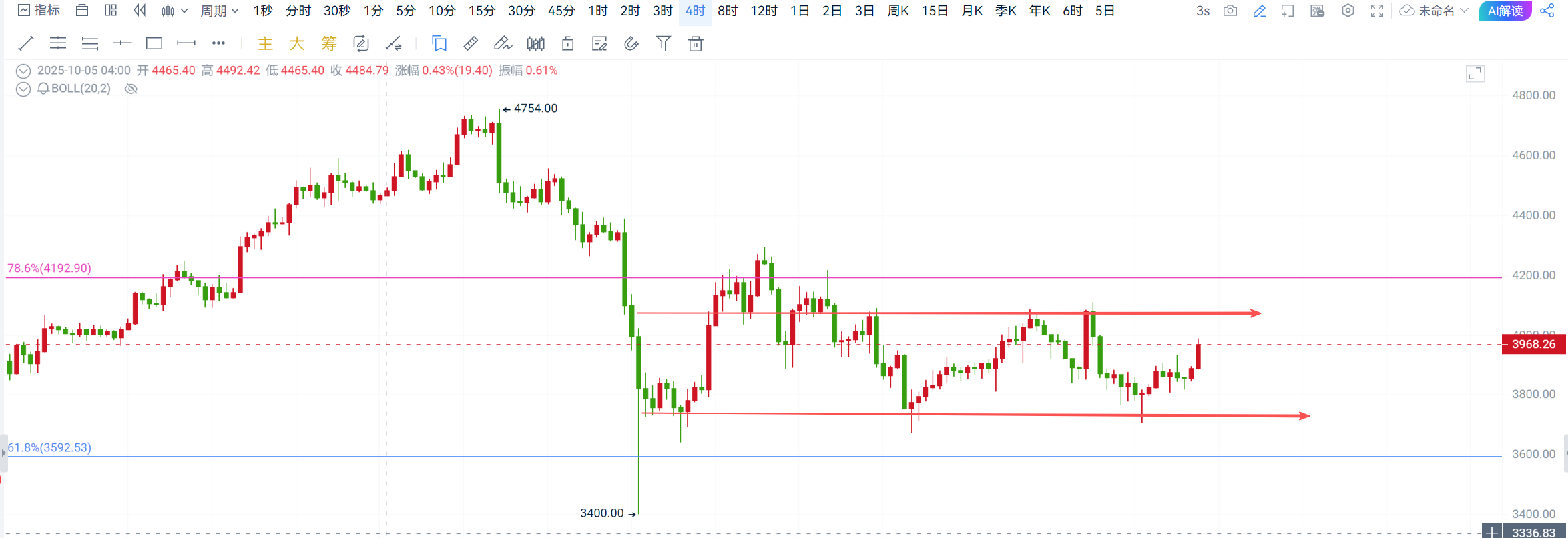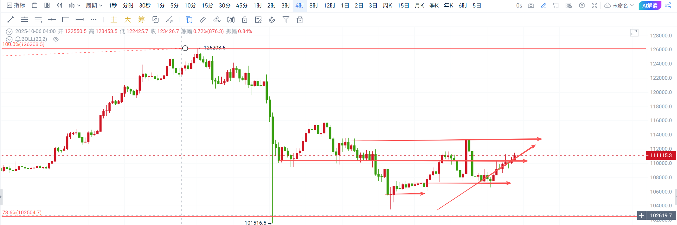 4小时级别看,大饼低位逐步上移,短线压制111500,破位看到113000附近,支撑转换成110500,以太4小时形成下插探底后冲破短线压制位3880-3900,目前压制在3980-4080,短期还是会保持箱体运行;