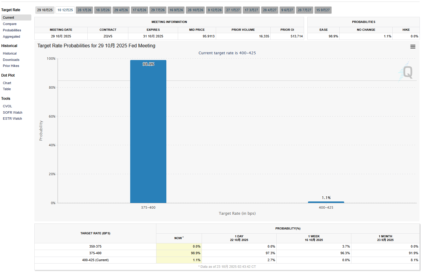 目前美国政府还处于停摆状态,但今天晚上20点30分仍然会公布美国九月的通胀数据,从市场预期来看,广义通胀的年率预期是3.1% ,相比上个月上涨的幅度还是挺大的,克利夫兰联储的预期是3.0%。虽然通胀是上涨的,但市场的解读是因为八月份开始的新关税导致了通胀的上涨,因为关税是一次性的,所以通胀很可能也是一次性的,这就对美联储的政策没有太大的影响。现在的美联储主要注意力应该是在劳动力市场,尤其是在政府停摆的时候,劳动力的数据虽然没有公布,但大概率是不好的,所以从目前的数据来看 CME 给出的10月降息概率是98.9%。