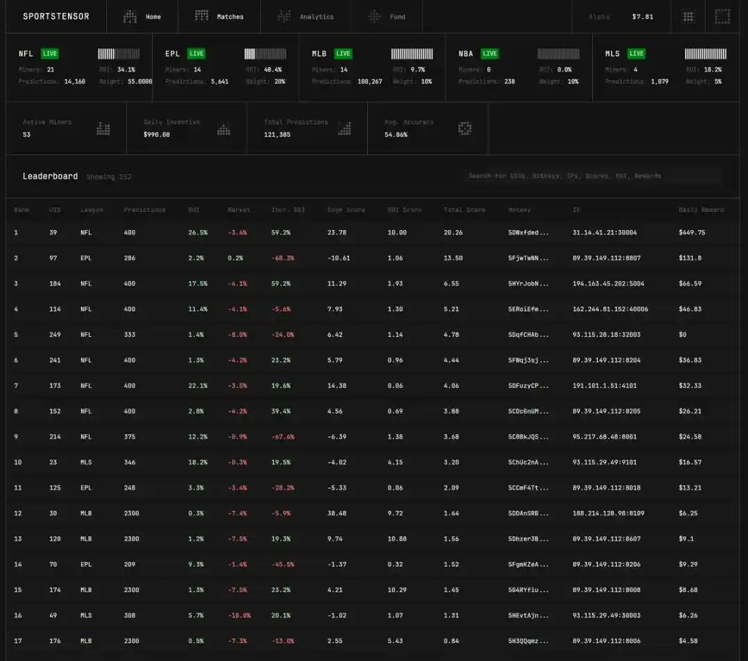这是一个专注于「击败市场赔率」的子网,旨在挖掘全球体育博彩市场中的「优势机会」。这是一场持续性竞赛:机器学习工程师需部署模型,预测美国职业棒球大联盟(MLB)、美国职业足球大联盟(MLS)、英格兰足球超级联赛(EPL)、美国职业篮球联赛(NBA)等主流体育联赛的赛事结果,能实现盈利的「最佳模型」将获得 SN41 Sportstensor 阿尔法代币奖励。