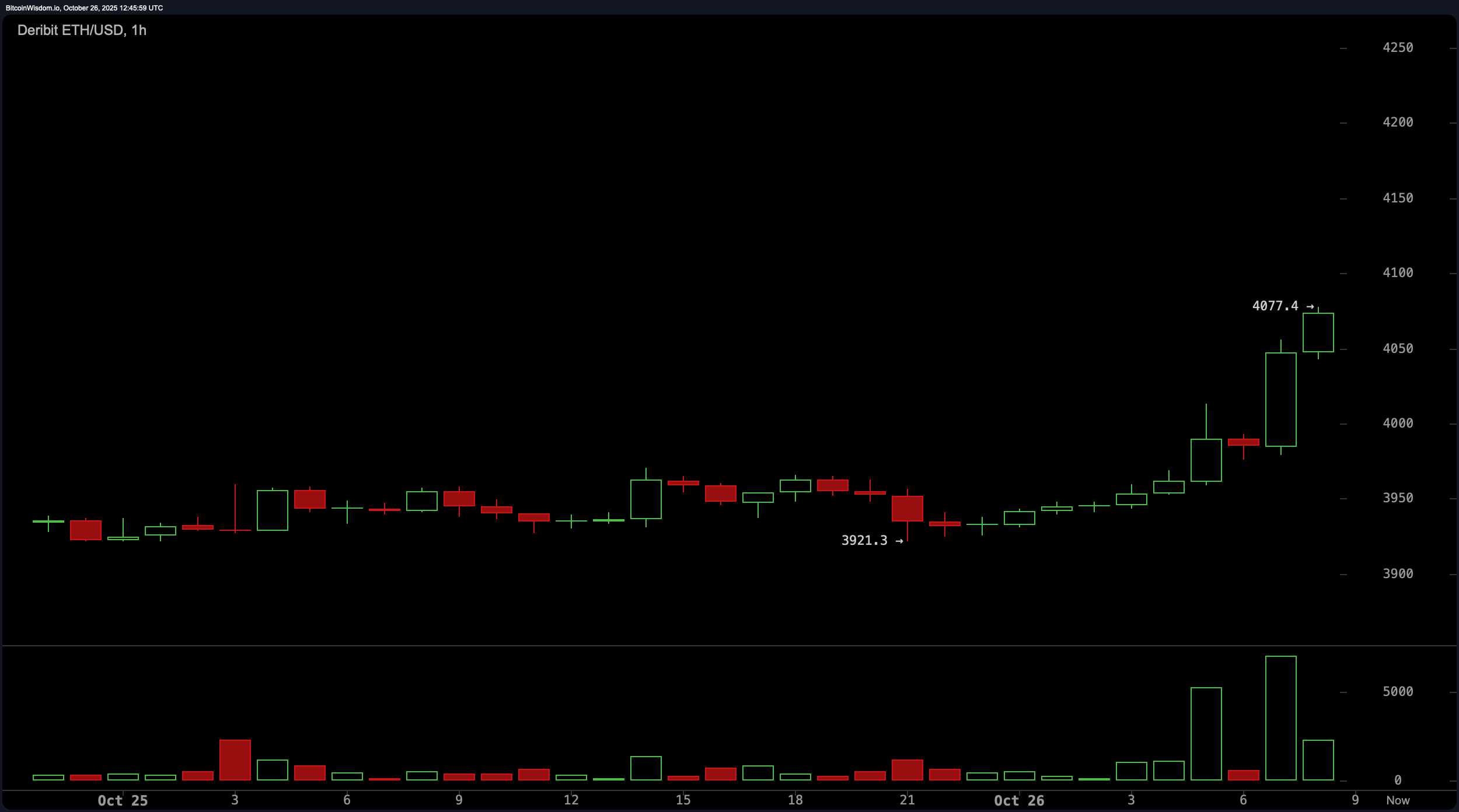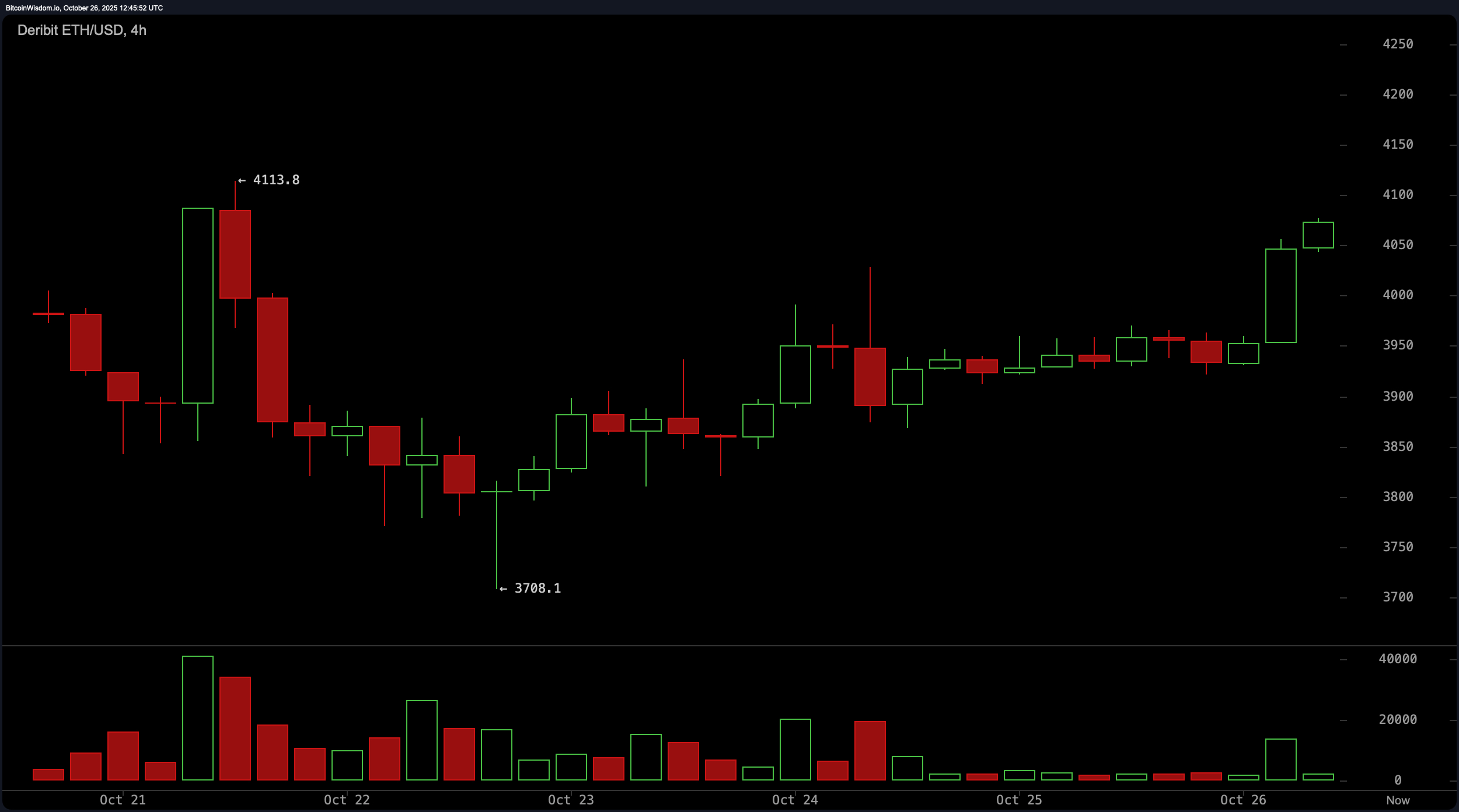 在1小时图(1H)上,以太坊全速前进,毫无刹车。它冲向会话高点 $4,081.9,借助早盘的热情。结构如教科书般完美:小蜡烛的积累转变为大型绿色突破,伴随着交易量的强劲激增。然而,它并不免于短期的泡沫。回调至 $4,000–$4,025 区间可能提供战略性重新进入的机会,特别是如果价格在再次上涨之前进行整合。通过在 $3,985 以下进行严格的风险控制,短线交易者可能会发现 $4,090–$4,100 区域适合操作。