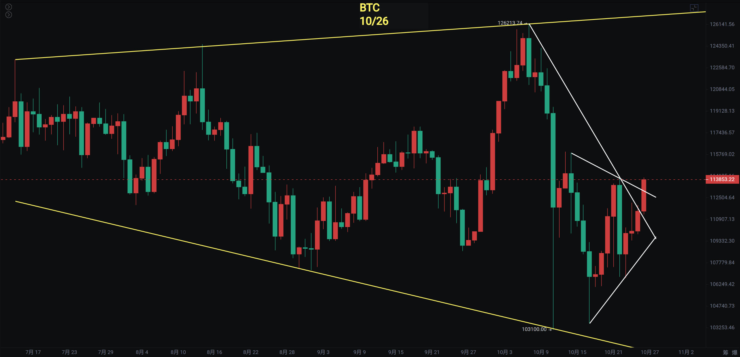 比特币自暴跌后已窄幅震荡近半个月,二次探底插针未跌破前低,当前价格在113700美元附近。本周走势至关重要,将决定后续是震荡上行还是延续调整:周线呈现阳线形态,价格显露出突破布林中轨的迹象,若下周收线能站稳布林中轨上方,则有望向布林上轨发起冲击。从技术面看,目前反弹受阻于斐波纳契0.5回调位,后续若能触及0.6至0.786区间,大概率会先经历一波回调再重启反弹。