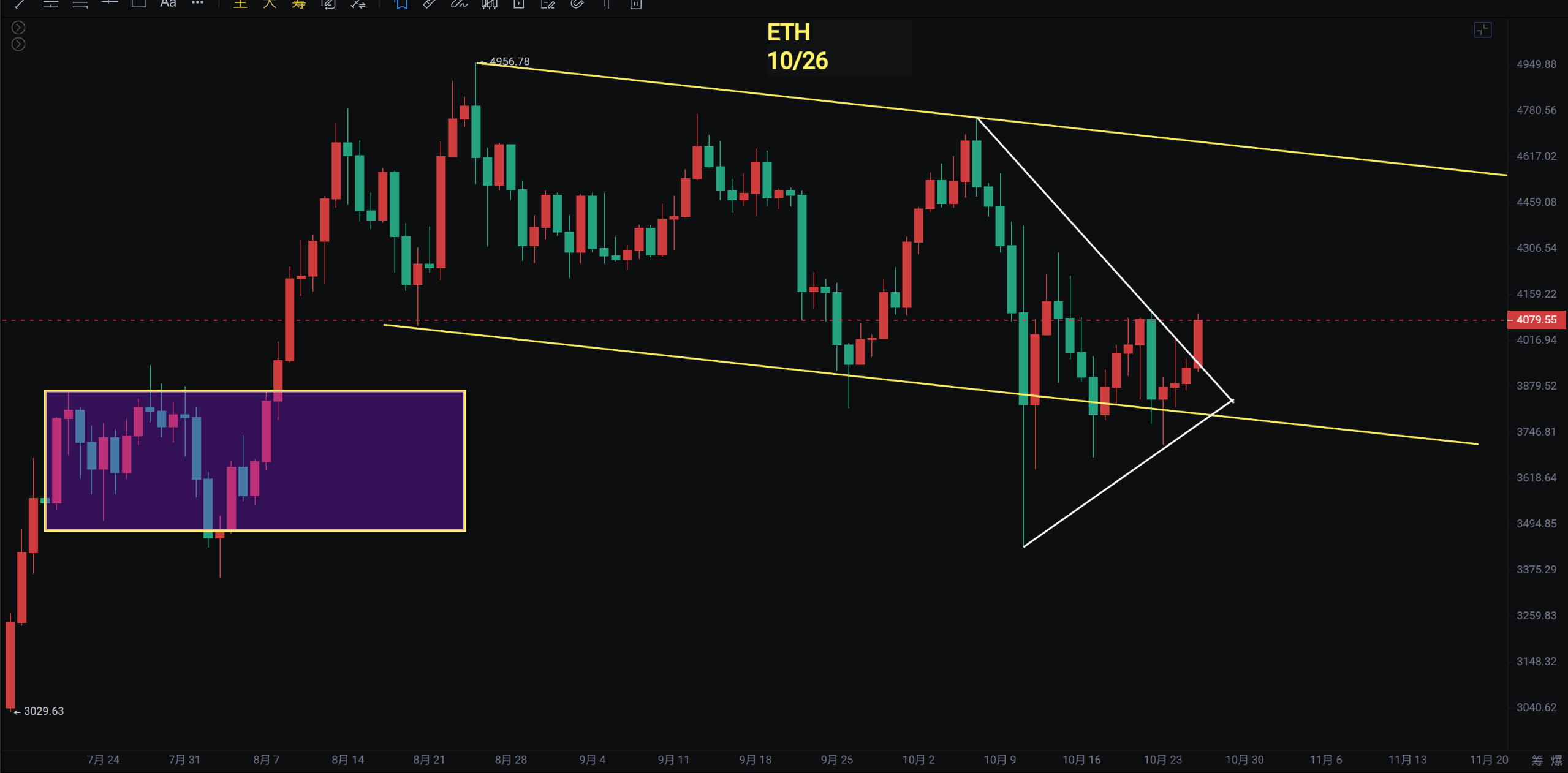 以太坊周线在“双阴夹阳”形态后连续两周收十字星,反弹动能偏弱。周线MACD指标连续两周处于零轴下方,快慢线形成交叉,但价格未跌破布林中轨;日线级别此前呈箱体震荡,后转为下降通道运行,当前价格在4060美元附近徘徊,若能突破4300美元,则有望测试通道上沿。