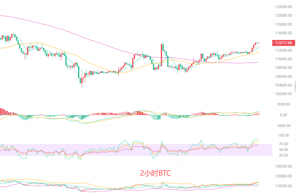 比特币现价113700,丽盈判断大饼处于上涨趋势,技术面表现出较强的看涨信号,短期均线形成黄金交叉,显示趋势延续的可能性较高。然而成交量的极度萎缩形成了显著的量价背离,表明当前上涨缺乏足够的资金支持,短期内存在回调风险。112000作为关键支撑位在该位置形成了看涨吞没形态,暗示短期内可能存在反弹机会,但需关注成交量变化以确认趋势的延续性。日线连续上涨多根阳线强势上行趋势。2小K线在114000处有明显压力。MACD2小时短期可能进入调整阶段。EMA2小时均线呈现多头排列,短多抵达了关键节点,丽盈选择获利了结等待新的信号出现以后再入场