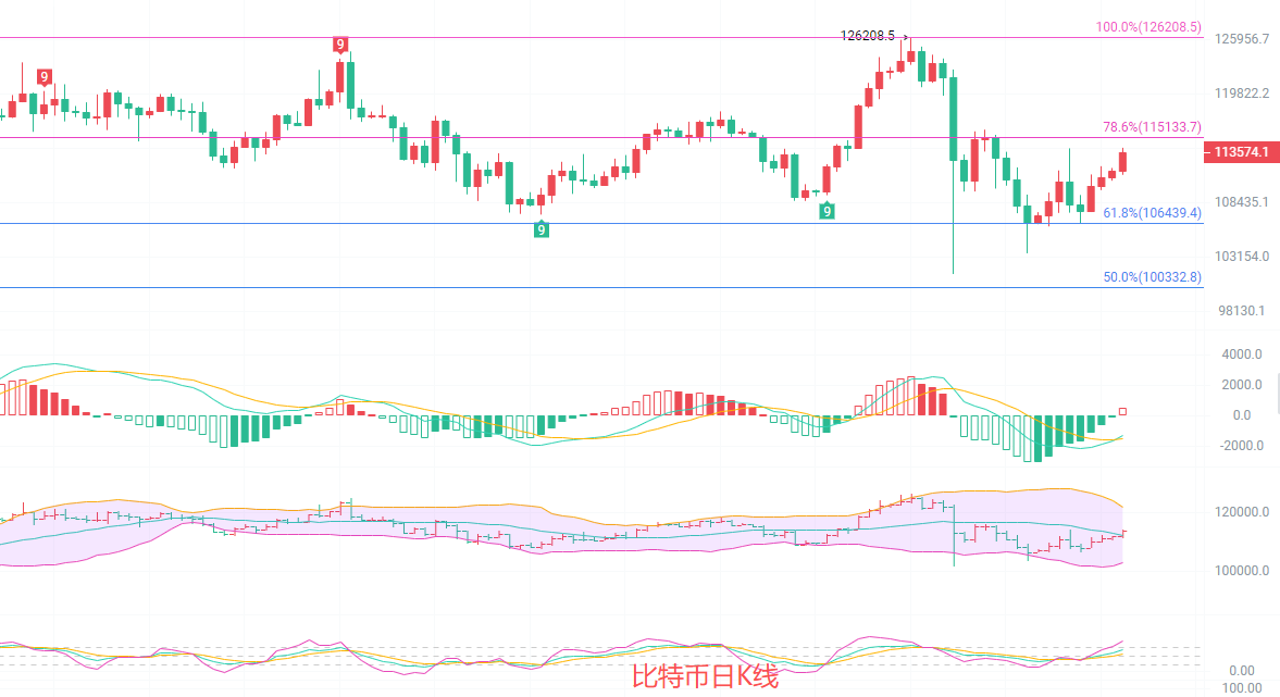 Before the article was published, the daily K-line reached a high of 114,000 and a low of 111,200. Four consecutive bullish candles broke the EMA30 resistance point at 112,600, bringing the market into a bullish phase. The trend indicator's upper resistance point at 113,300 has been broken. The next step is the resistance at the 0.786 Fibonacci retracement level of 115,100. The MACD has ended its contraction and is starting to expand, while the Bollinger Bands have lost the middle line at 112,300. The K-line has entered an upward channel, and now the pressure has turned into support. Pay attention to the strength of the support at 112,300 for a potential short-term upward move.