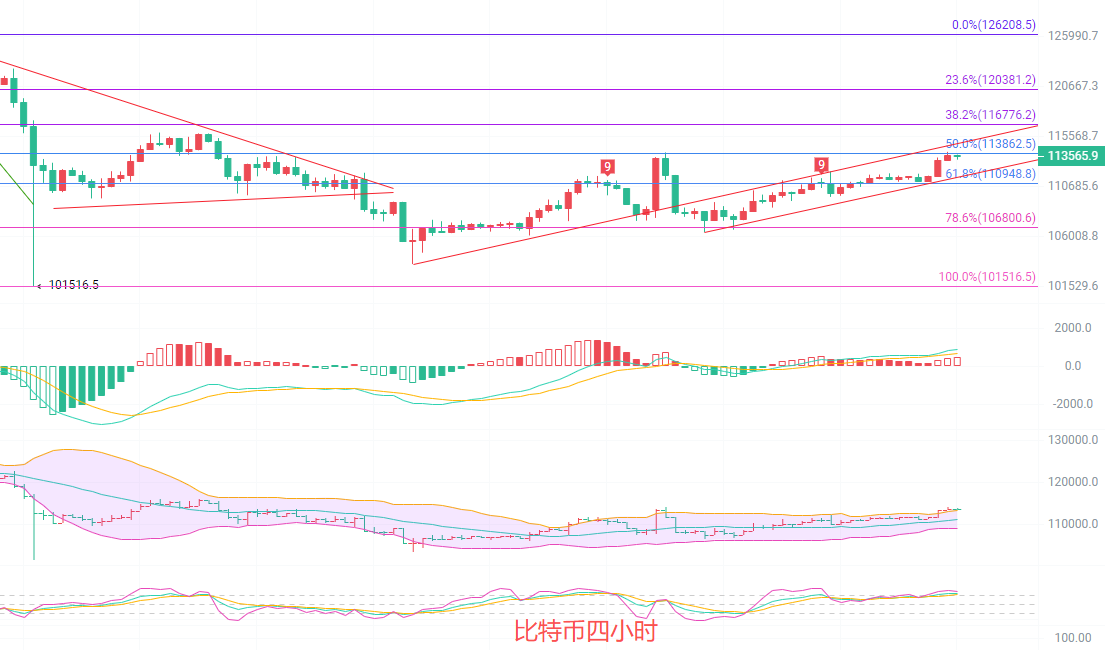 The four-hour K-line has reached the 0.5 Fibonacci retracement level resistance at 113,860, which is currently forming a clear pressure point. The MACD is continuously expanding upward, and the K-line has entered an upward channel. The trend indicator is starting to contract upwards, with the EMA15 impacting the 120 line at 112,000. The upper Bollinger Band at 113,400 has been lost, and the short-term market has entered an extremely overbought condition, posing a risk of a pullback. At this time, whether long or short, the risk outweighs the reward. The best approach is to protect your current holdings and wait for key signals to decide on entry details.
