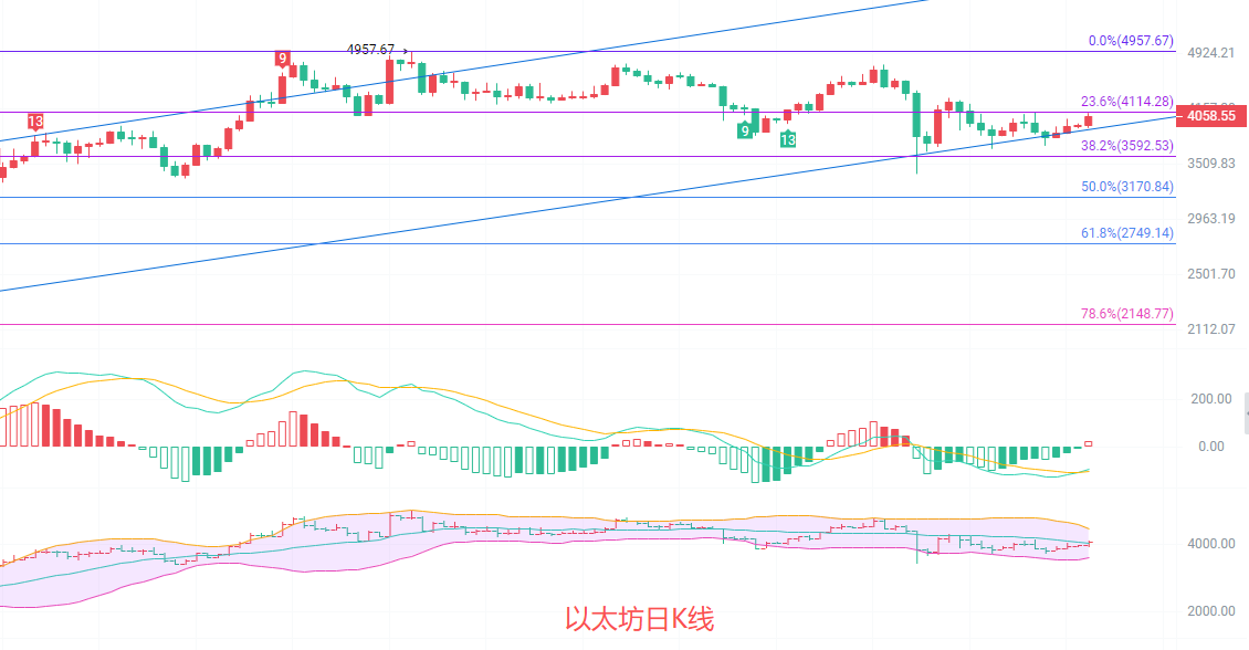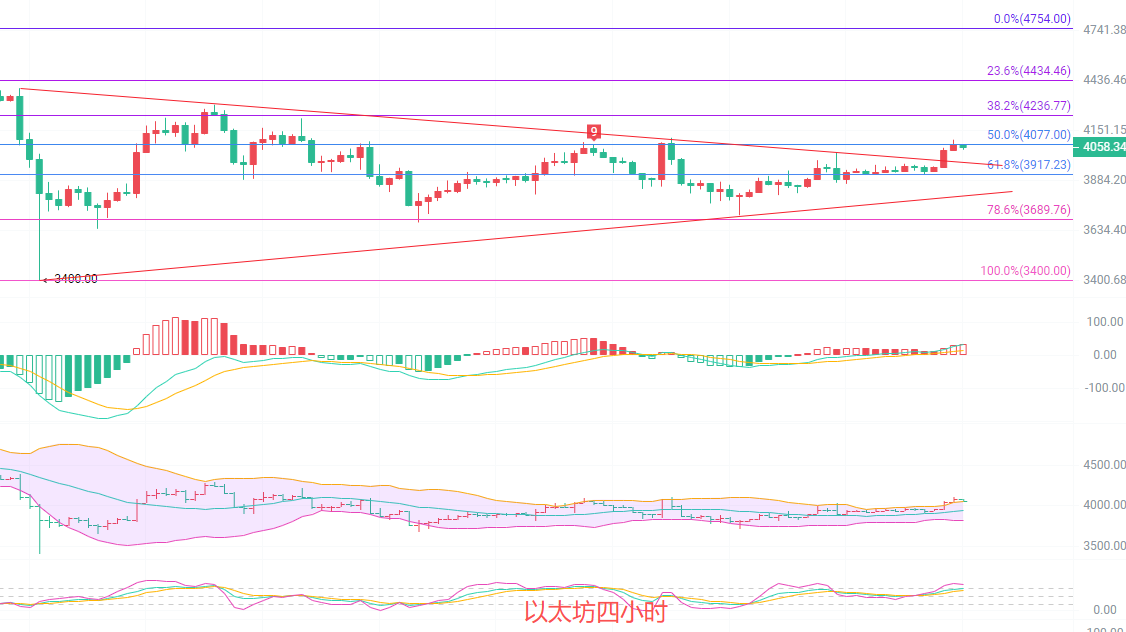 The four-hour K-line has broken the EMA trend indicator high point resistance at 4,025, challenging the key resistance at the 0.5 Fibonacci retracement level of 4,077. Currently, there has been no solid breakthrough. After the triangle breakout, will the main force return to test the triangle support at 3,990? Or is this wave a false breakout? The MACD is continuously expanding, but the DIF and DEA have not shown energy indicators. The Bollinger Bands are expanding, and after breaking the upper Bollinger Band at 4,055, the K-line has started to return to the channel. The current market suggests being prepared for both bullish and bearish scenarios.
