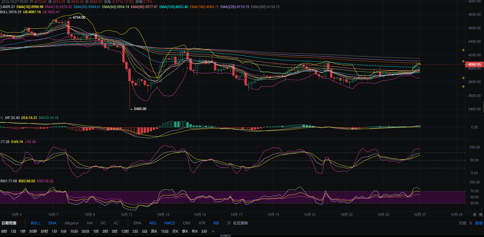 今日以太坊建议做空点位一:4110上方轻空,止损4250上方;目标4050-3970;破位3950可继续持有!空单具体入场机会可以关注历辉实时更新!