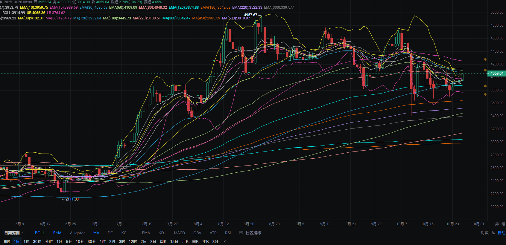 日线上昨日历辉也说到破位EMA80会考虑EMA60顶部压制,行情也是刚好走到此位置形成回调,短线行情如果继续受到支撑,那么二探EMA60成功还会冲击到MA60位置(4250)!那么空单入场点就需要继续上调!