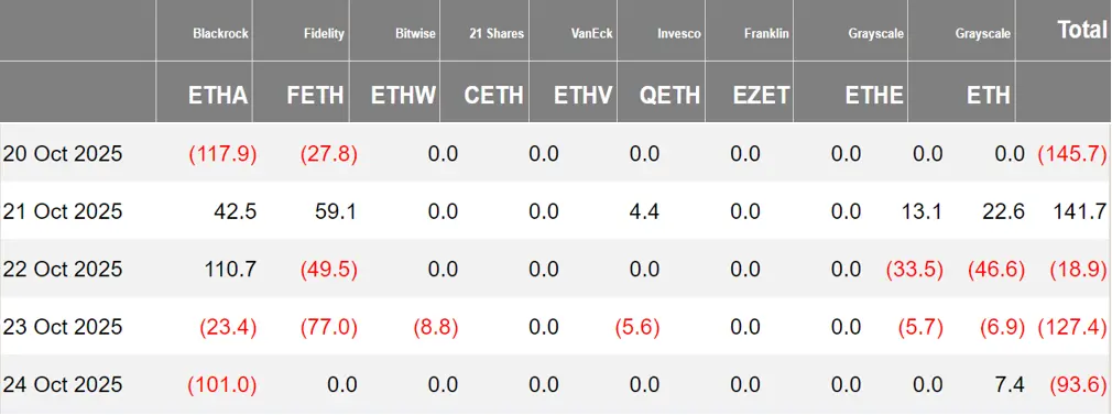 上周流出主要来自贝莱德 ETHA,净流出 9520 万美元。6 只以太坊现货 ETF 处于净流出状态。