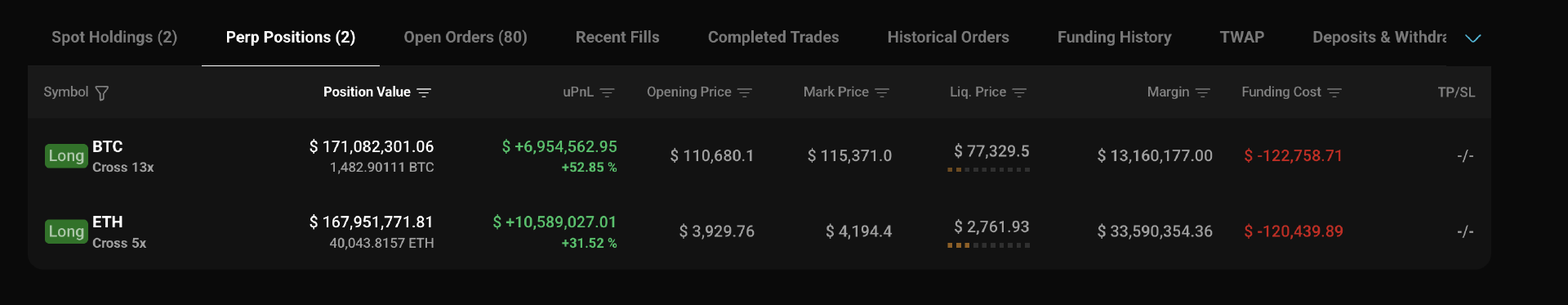 HyperBot数据显示,“10.11 至今胜率 100%巨鲸”目前持有的 13 倍 BTC 多单和 5 倍 ETH 多单已浮盈约 1754 万美元,且暂时仍未止盈,三小时前该巨鲸甚至还追加建仓了 1868 枚 ETH 多单。目前,该巨鲸的持仓总价值约 3.39 亿美元,其中 BTC 多单价值约 1.71 亿美元,开仓价为 110680 美元;ETH 多单价值约 1.68 亿美元,开仓价为 3929 美元。