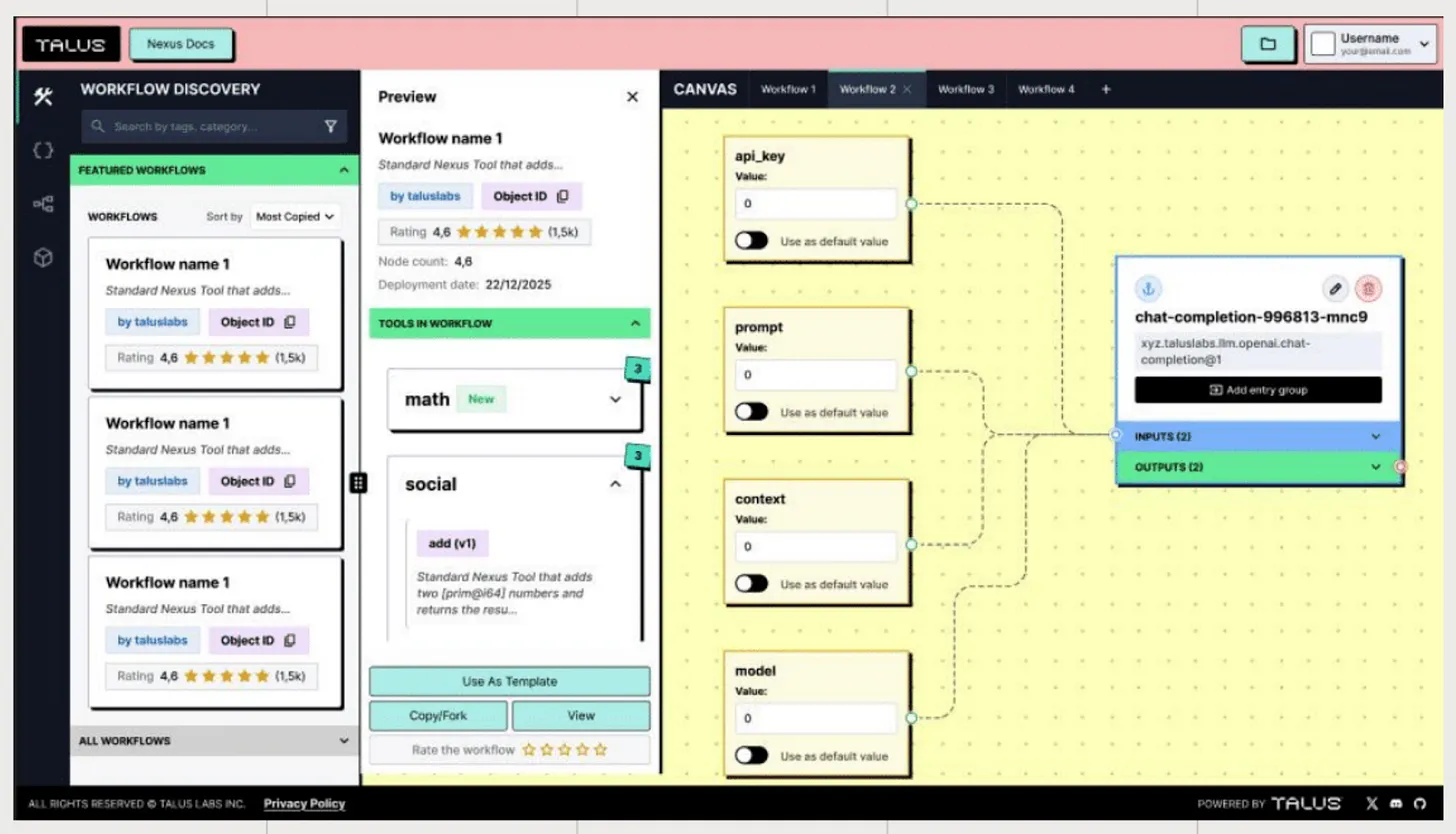 However, Talus's goal is not limited to building trust mechanisms. Trust is a prerequisite for an autonomous digital economy, but trust alone cannot make the economy function properly. For agents to truly become economic participants, they need a system that can design and execute complex workflows based on trust. To address this issue, Talus has launched Nexus, a workflow development framework. Nexus is a decentralized version of services like n8n or Zapier. It allows developers to easily write and deploy agent workflows in an on-chain environment without needing deep knowledge of blockchain technology.