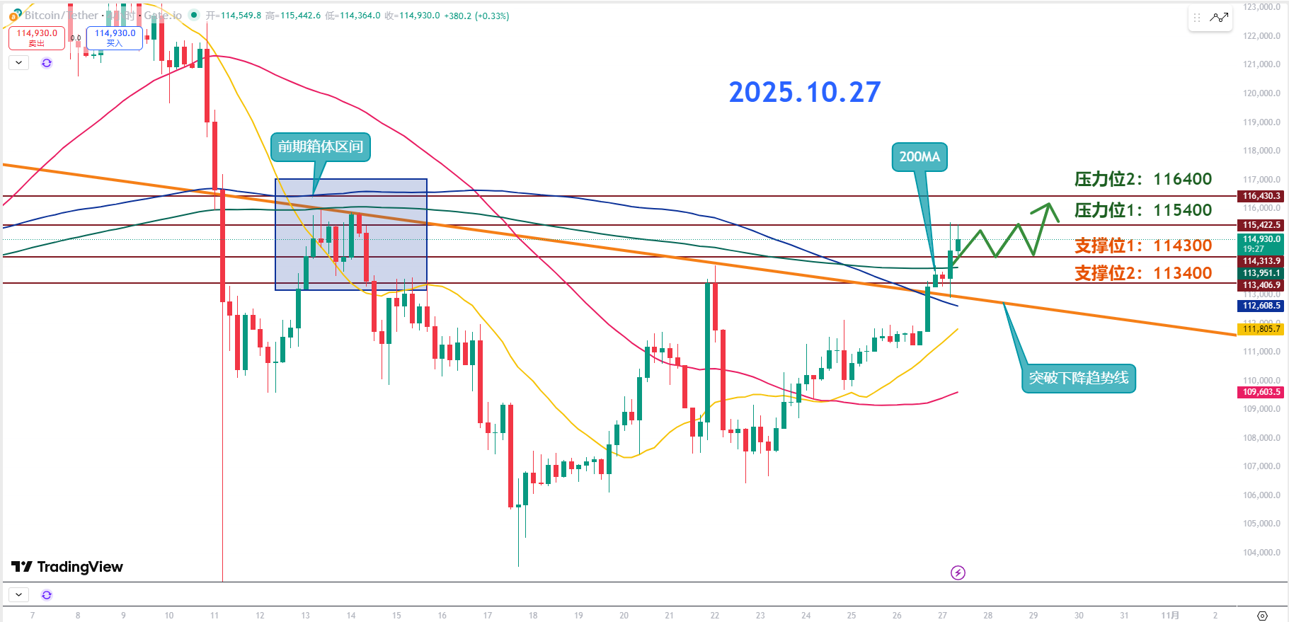 Short-term support is at 114.3K; if it stabilizes around that area, the bullish pattern will remain unchanged. The strong resistance above at 116.4K is the previous high; if it rushes up to that level, there may be a brief pullback. A conservative approach would be to wait for a retest before entering.