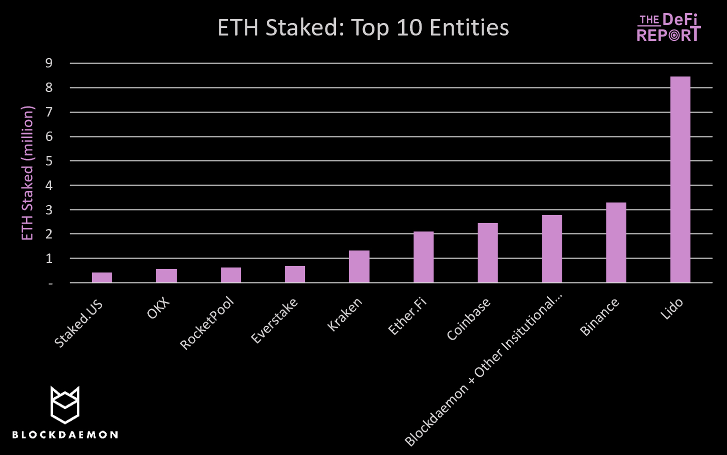 • Specialized staking service providers like Blockdaemon have staked an additional 1.28 million ETH over the past year. Blockdaemon grew by 126%, followed by Figment (75%) and Kiln (4.3%). Institutional staking service providers currently hold 7.8% of the staked ETH supply.