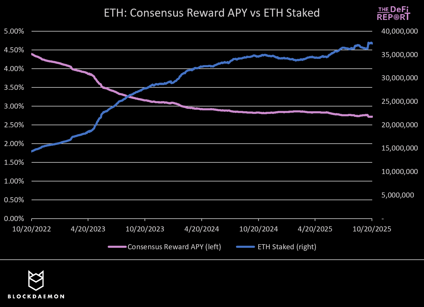 The compression of base staking rewards may have significant downstream effects on Ethereum's DeFi ecosystem. As the "risk-free" rate of holding ETH declines, capital may seek higher returns (albeit with greater risks), thereby fostering further innovation.