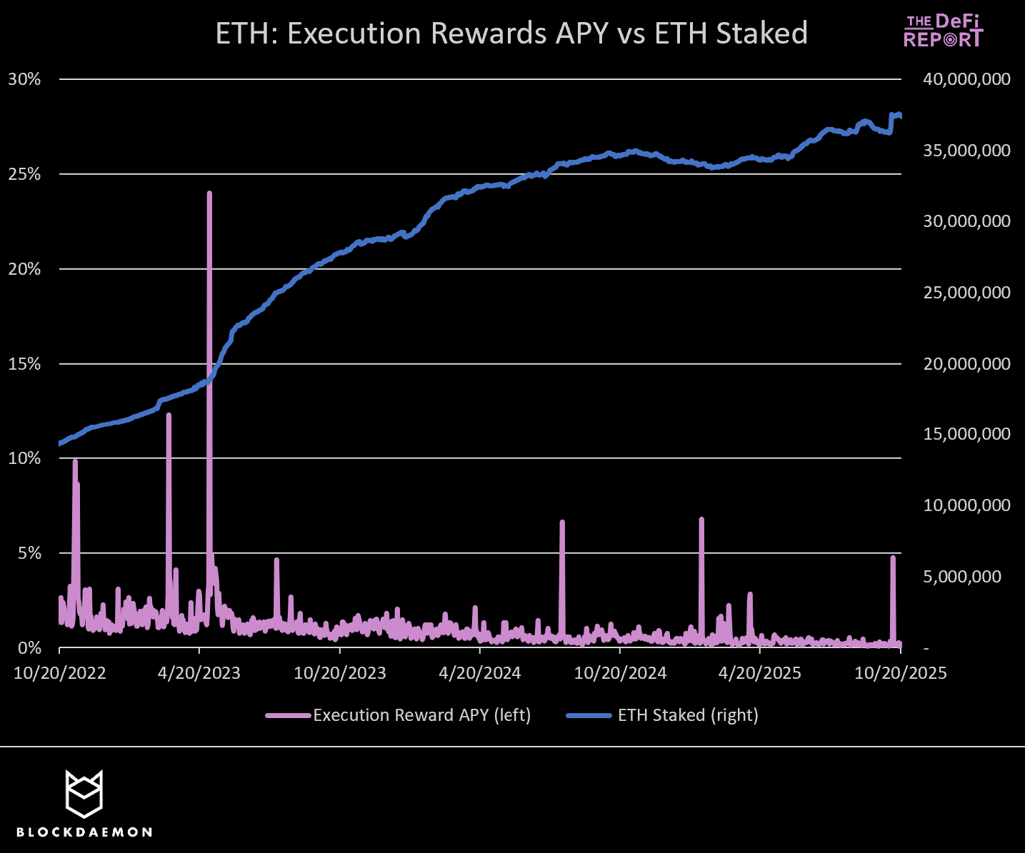 These same reward compression dynamics also apply to the execution reward APY of ETH—it relies on on-chain user activity (priority fees and MEV) as well as the amount of staked ETH.