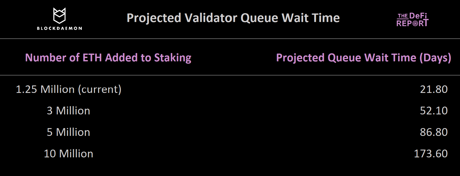 The Ethereum protocol is not designed to handle the demand that may come from regulated ETH staking products. Below, we can see the impact of various scenarios on the wait times for validators entering/exiting the queue: