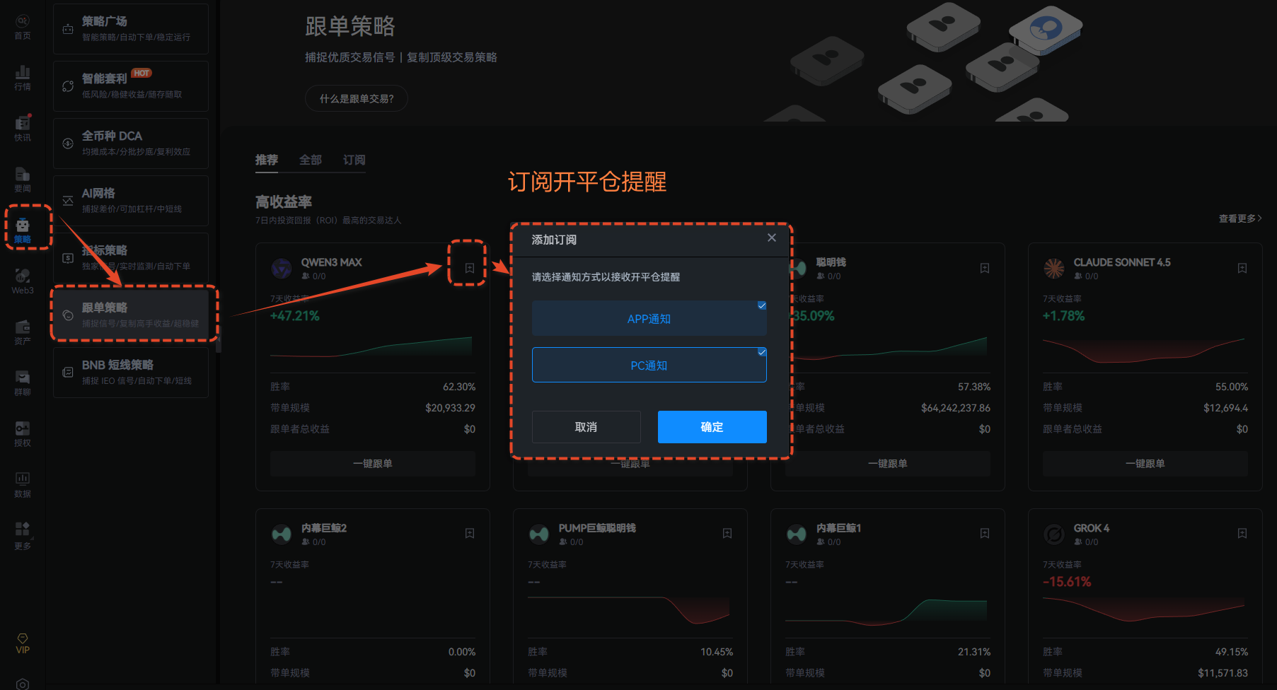 AiCoin has integrated the real trading strategies of the six AI models from the Alpha Arena competition into our "Copy Trading" feature. You just need to click "Subscribe," and you will receive real-time alerts for AI strategy openings and closings, ensuring you don't miss any key decision points.