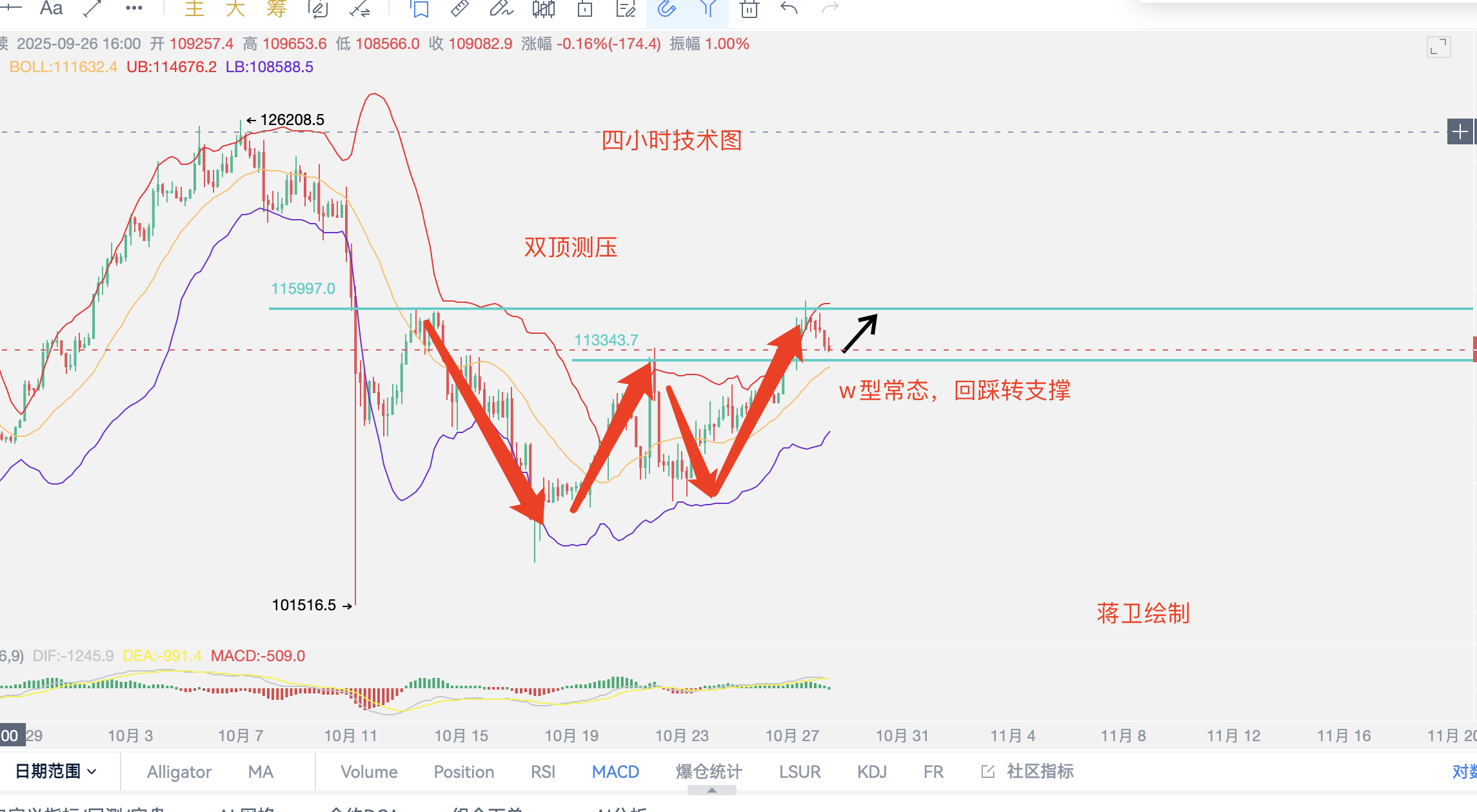 Now, the four-hour K-line has formed a W double top pattern, and the pressure from the double top will inevitably lead to a pullback, so a retracement is a normal occurrence. If there is no pullback to build strength, how can there be momentum to break through new highs? Currently, the K-line has formed five consecutive small bearish candles and is about to test the support point of the middle track. When it reaches the support point, it will be our opportunity to be bullish. Therefore, today we will primarily focus on bullishness during the pullback.