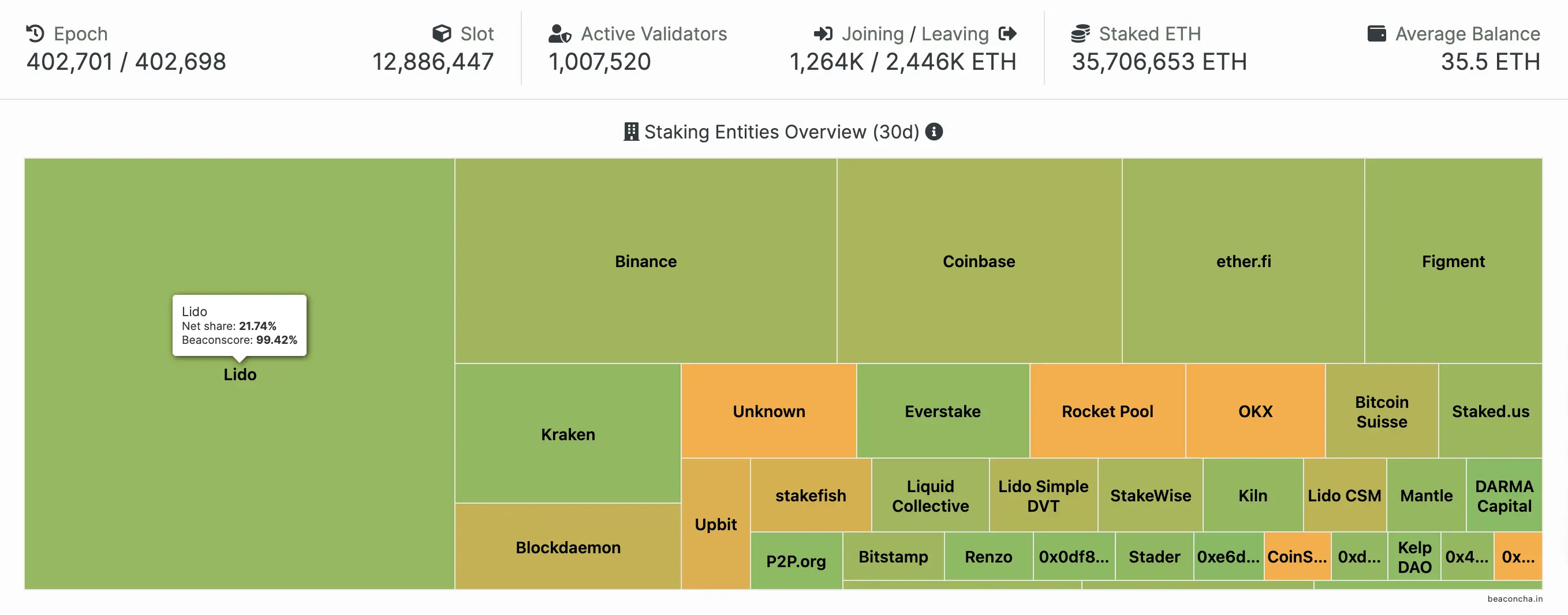 不知不觉,以太坊的总质押量已经来到了 3500 万枚左右(不同数据统计网站会存在一定差异)。该数字从 1500 万增长到 2500 万用了一年左右的时间,但从 2500 万增长到 3500 万却用了两倍的时间。可以预见的是,随着时间的推移,以太坊的质押量可能会在到达某一上限后进入质押和解除质押数量动态平衡的时期。