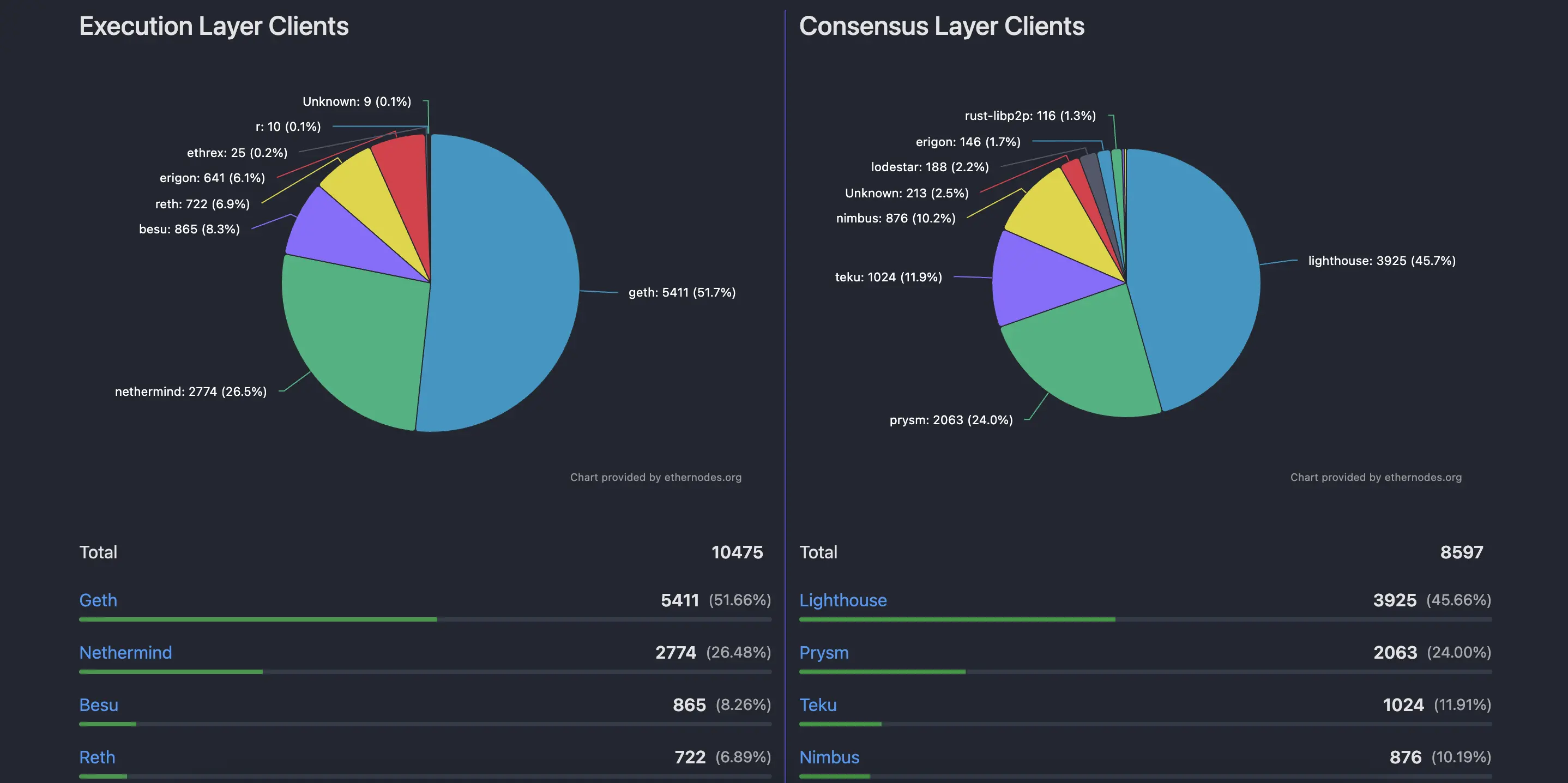 至于共识层客户端,在统计内的 8597 个共识层节点采用的客户端中,占比最高的是由澳大利亚安全公司 Sigma Prime 创立并持续维护用的 Lighthouse,达到了 45.66%。占比约 24% 的 Prysm 最初由区块链基础设施公司 Prysmatic Labs 开发和维护,该公司于 2022 年被 Arbitrum 开发公司 Offchain Labs 收购。排名第三的 Teku 占比 11.91%,与 Besu 同属一支开发团队。占比 10.19% 的 Nimbus 则是一支单纯依靠以太坊基金会等资助的团队,Nimbus 旨在提高资源效率,使节点运营商可以在资源受限的设备(如手机和笔记本电脑)上轻松运行以太坊客户端软件。