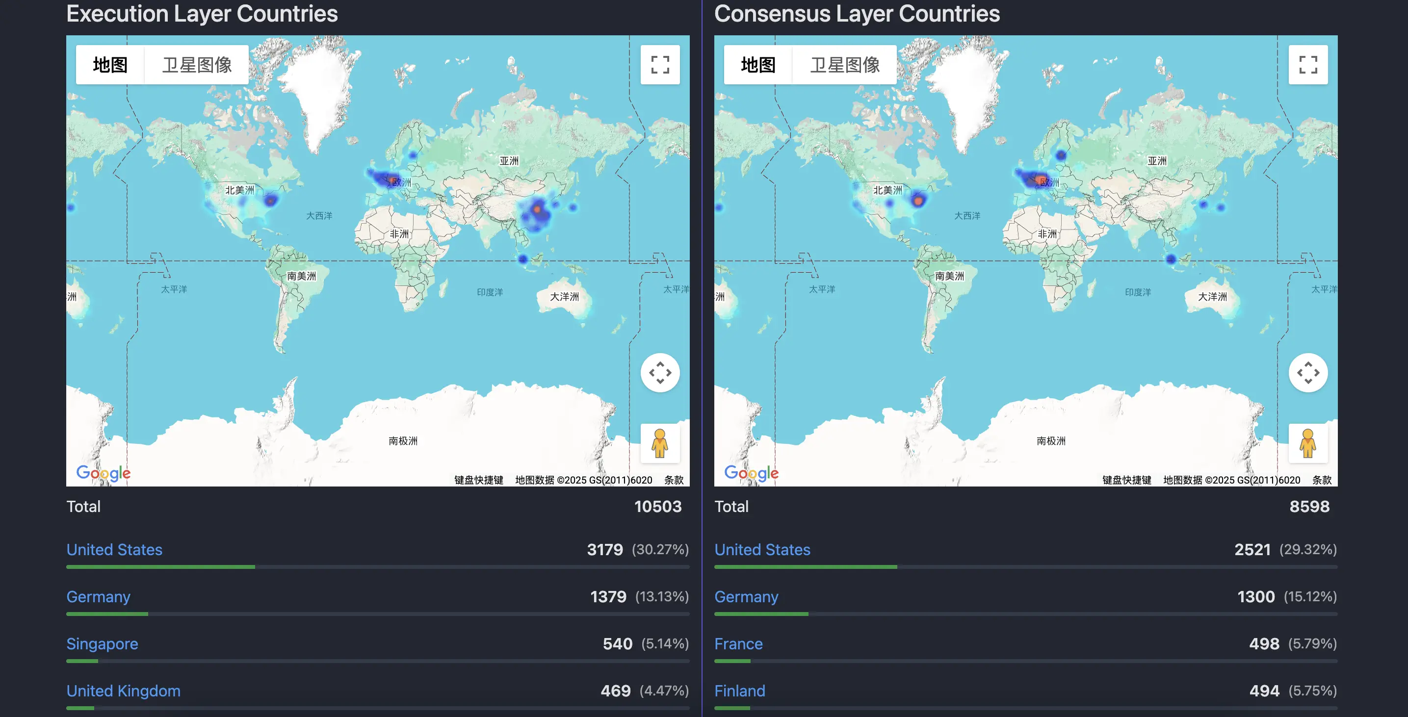 以太坊执行层节点和共识层节点所处的位置是一个非常难以准确辨识的数据,该网站也大概率是通过 IP 分析确定的位置,并不会非常准确,但也为我们大致勾勒出了分布的情况。