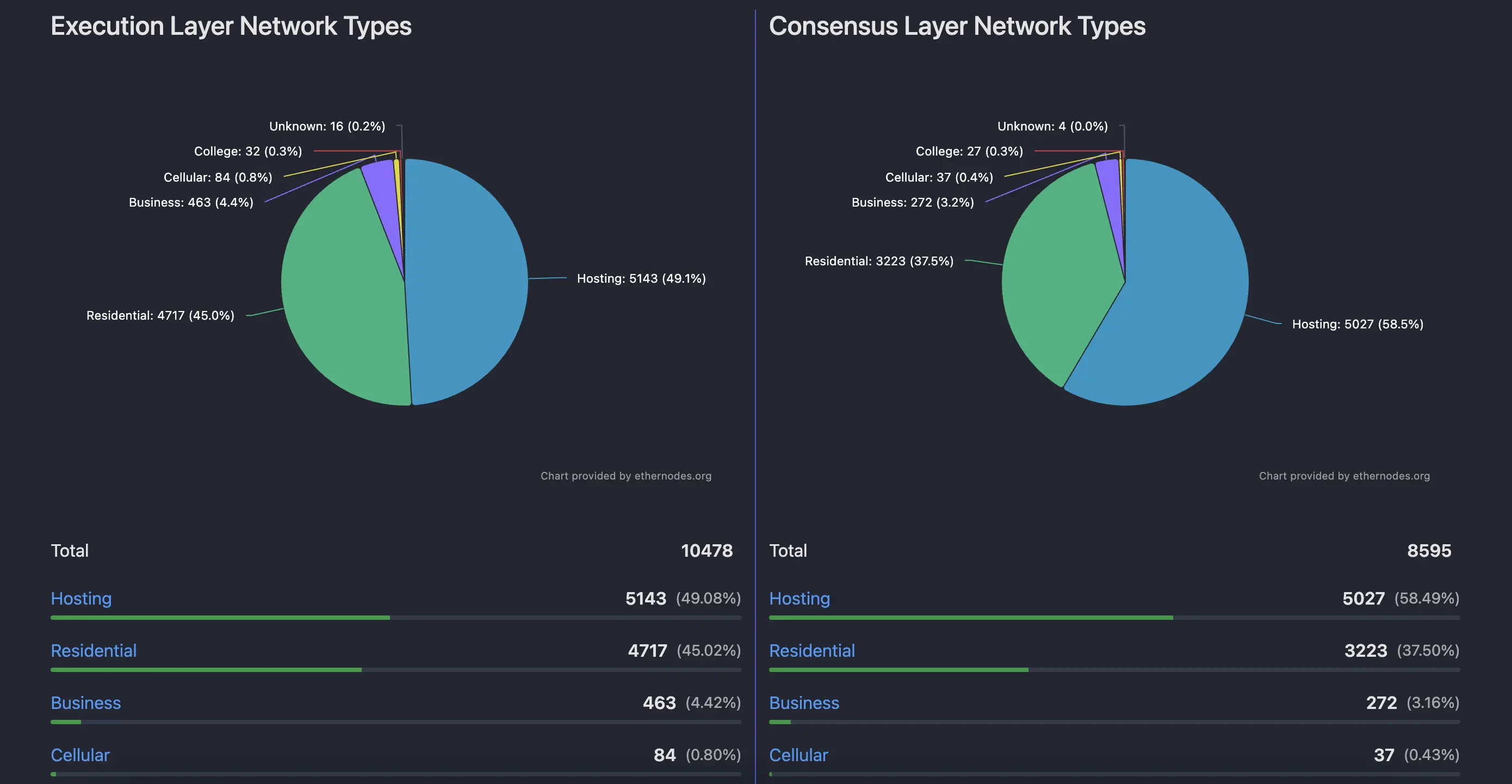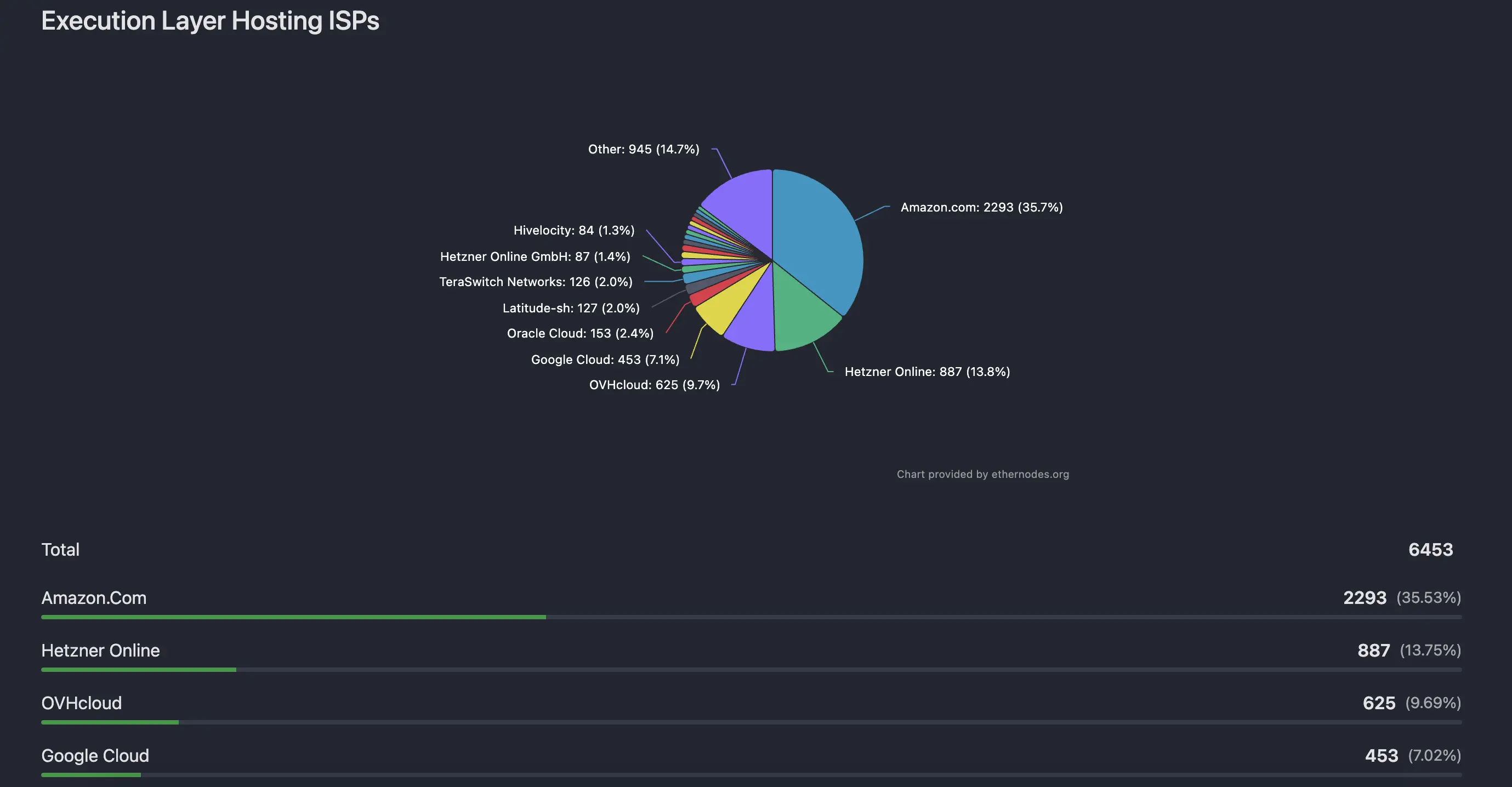 「一半的以太坊节点都在用 AWS」也算是行业里一个著名的烂梗,可能在几年前以太坊确实存在大量节点托管在云服务上的情况,但目前这一情况已经大大改善。