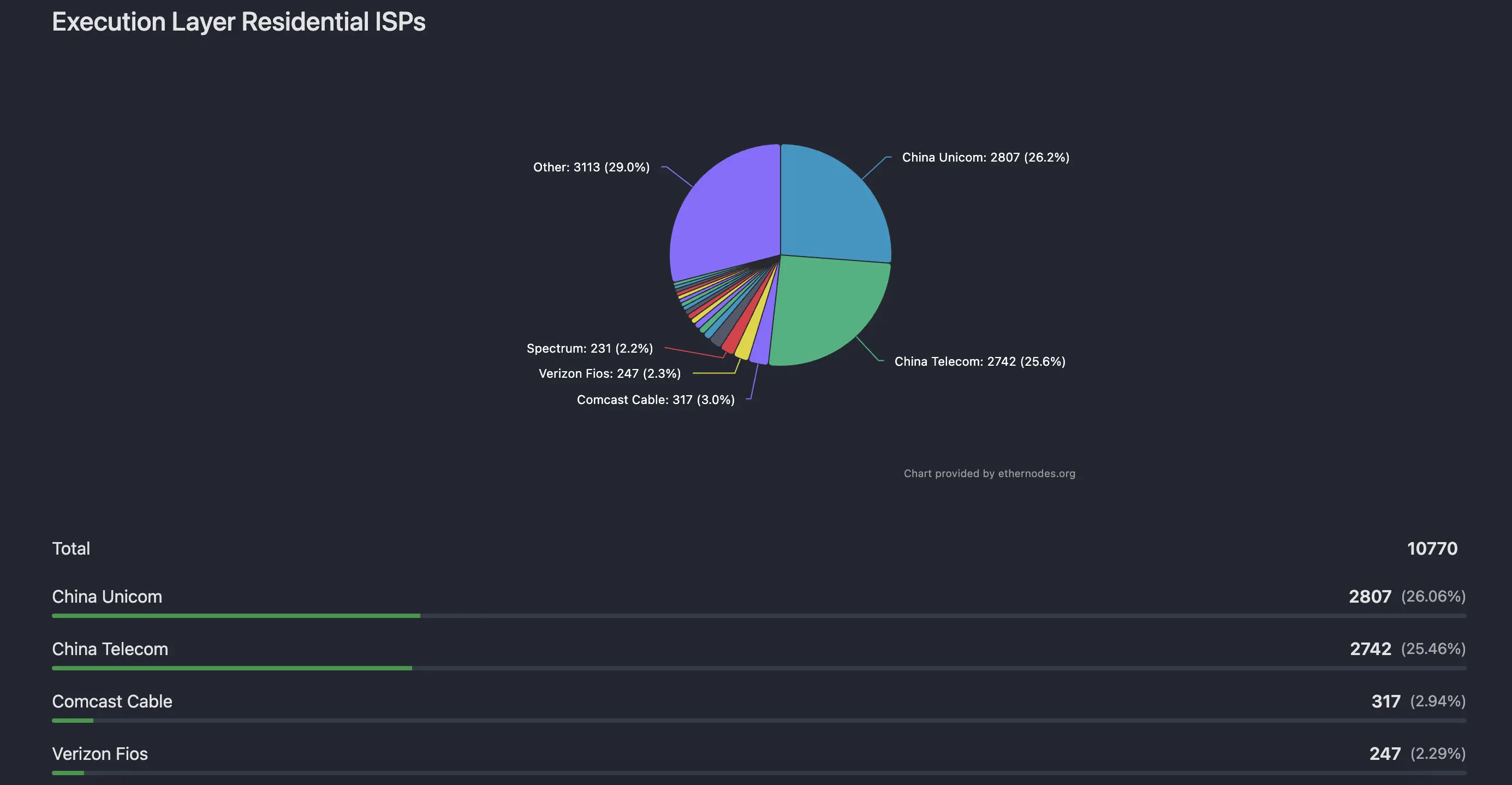 首先,针对运行执行层客户端的节点,在自建节点的互联网服务提供商中,中国联通和中国电信合计占到了 51.52%,此外还包括了中国联通工业互联网骨干网、中国移动与中国教育和科研计算机网中心、中国联通(深圳)、中国电信云南省 IDC1 网络、中国电信集团、北京百度网讯科技有限公司等。