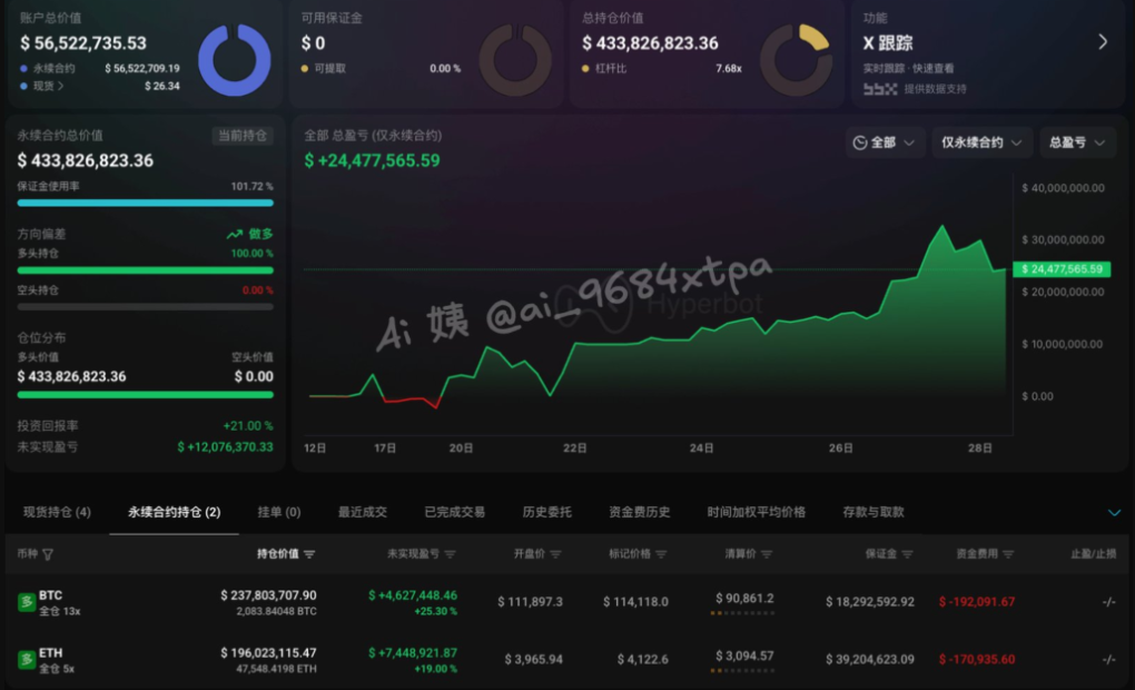 目前,他持有2083.84枚BTC(价值2.37亿美元)和47548.42枚ETH(价值1.96亿美元)的多头仓位,总多头头寸接近4.33亿美元。这位巨鲸从10月中旬至今的一系列精准操作,已在市场上创造了近乎神话的声誉。