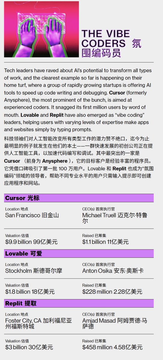 #Cursor(旧金山):原名AnySphere,目标是“为程序员打造AI助手”。估值99亿美元,融资11亿美元。它是最接近成为“程序员版ChatGPT”的产品,体验非常顺滑。我自己也有用Cursor来辅助做一些加密相关的dashboard分析看板,可以说它是 #AI 编程领域的绝对龙头,发展速度惊人。