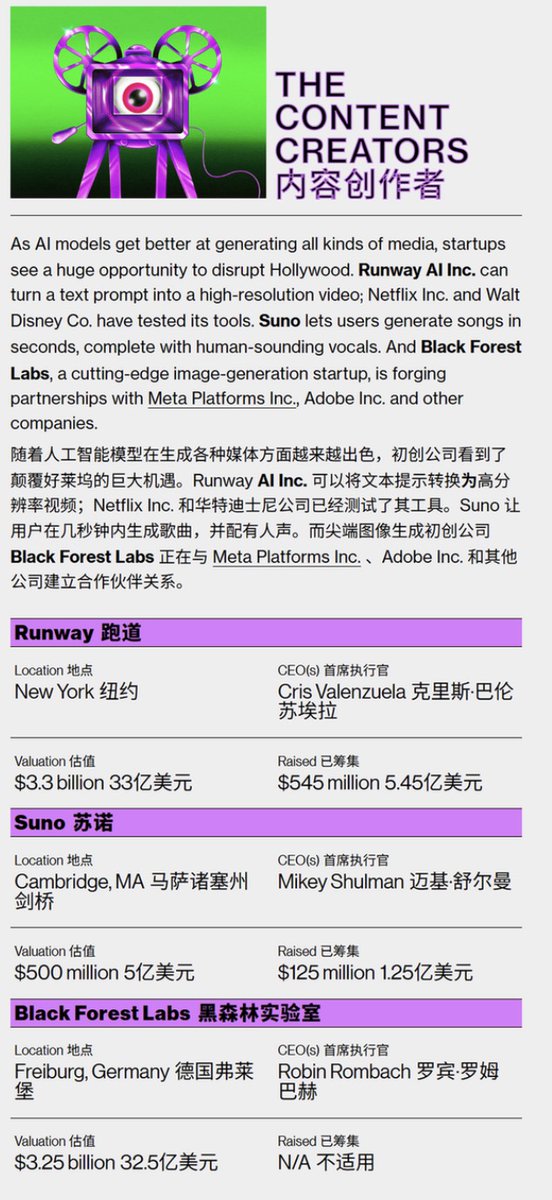 #Runway(纽约):最早做AI视频生成的公司之一,Netflix和迪士尼都在用。估值33亿美元,融资5.45亿美元。目前Runway 已经成为AI影视制作工具标配。