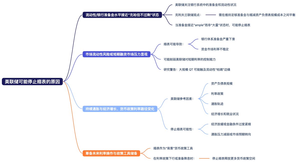 所以如果可以在十月停止缩表,则表示美联储的政策将从继续收紧流动性转为稳定的流动性供应,与降息路径相互配合,提升政策传导效率。银行体系准备金也不再继续下滑,回购与短端利率波动有可能会缓和,对信用利差与融资环境是温和且利好的。