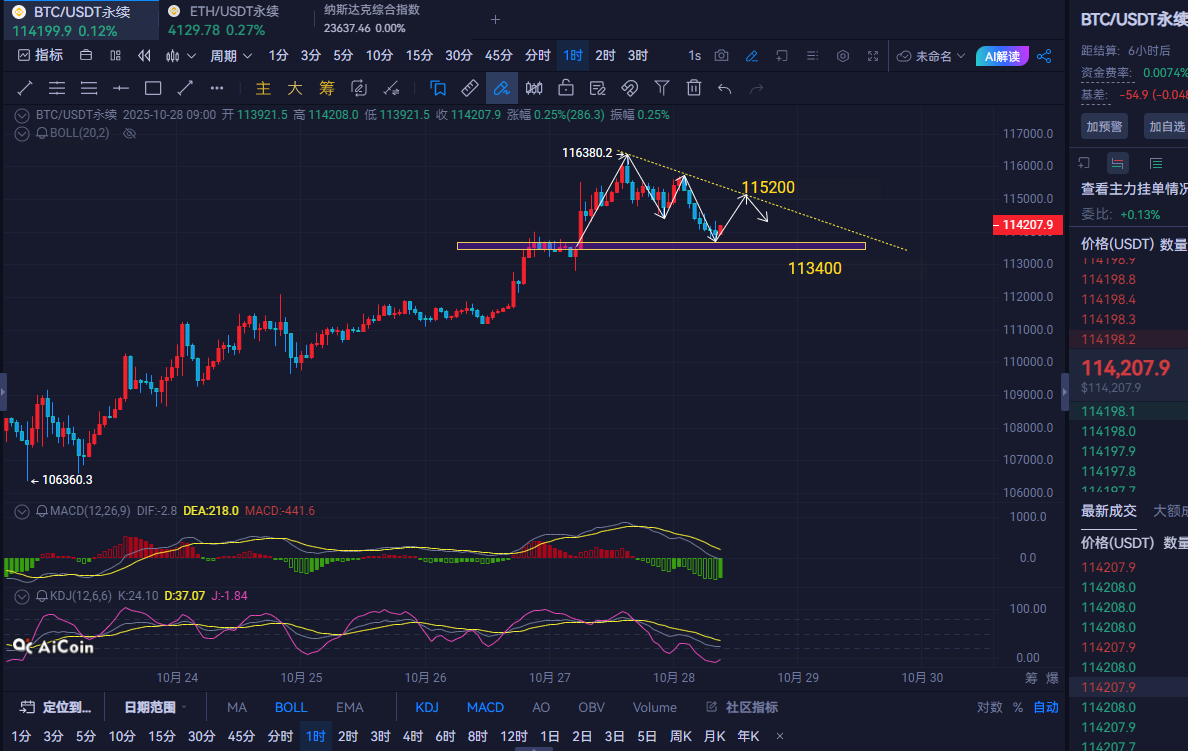 操作建议:大饼现价114200-113800附近多,防守113200,目标看到115300-115800附近,破位看116300-116800附近,不破接空。