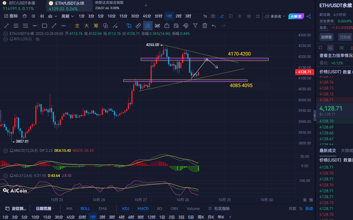 以太坊操作建议:现价4120-4090附近多,防守4070,目标看到4170-4200附近,破位看4250-4280附近,不破接空。