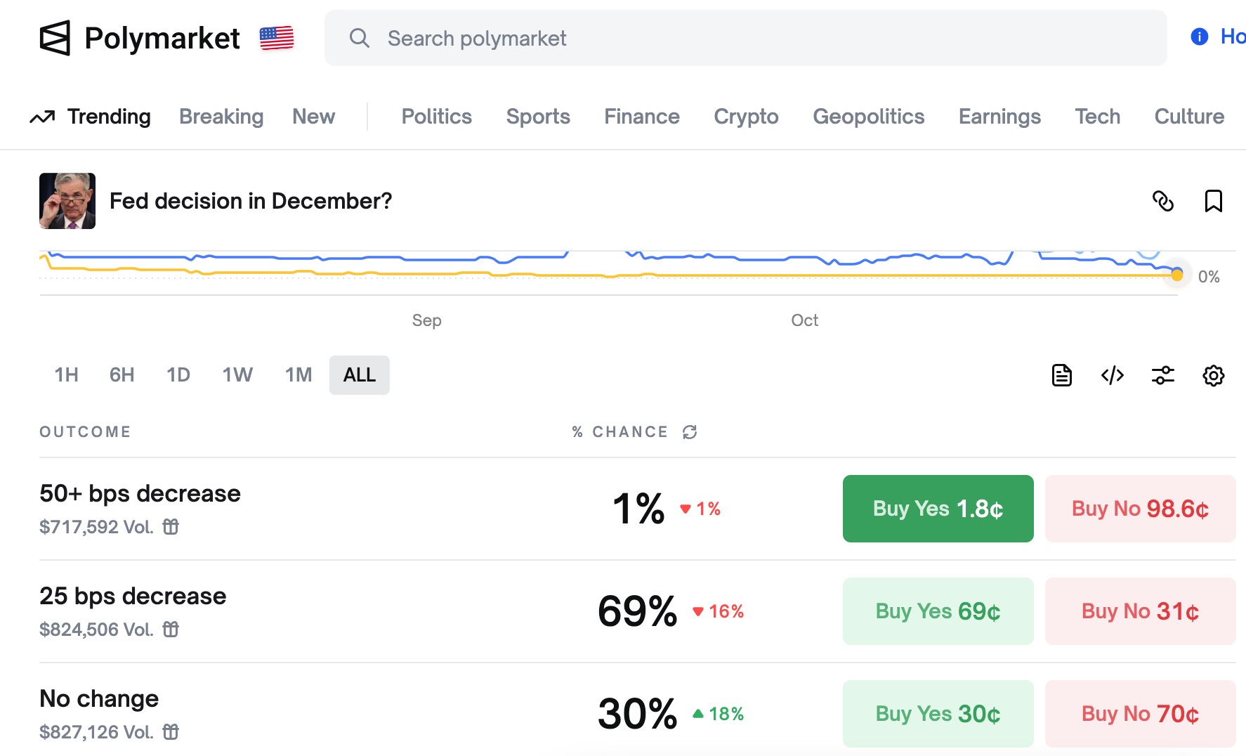 此外,截至撰文,Polymarket 上关于美联储 12 月利率决策的预测数据显示,再降低 25 个基点的概率为 69%(下降了 16%),保持不变的概率为 30%(上升了 18%),下降 50 个基点及以上的概率为 1%(下降了 1%)。