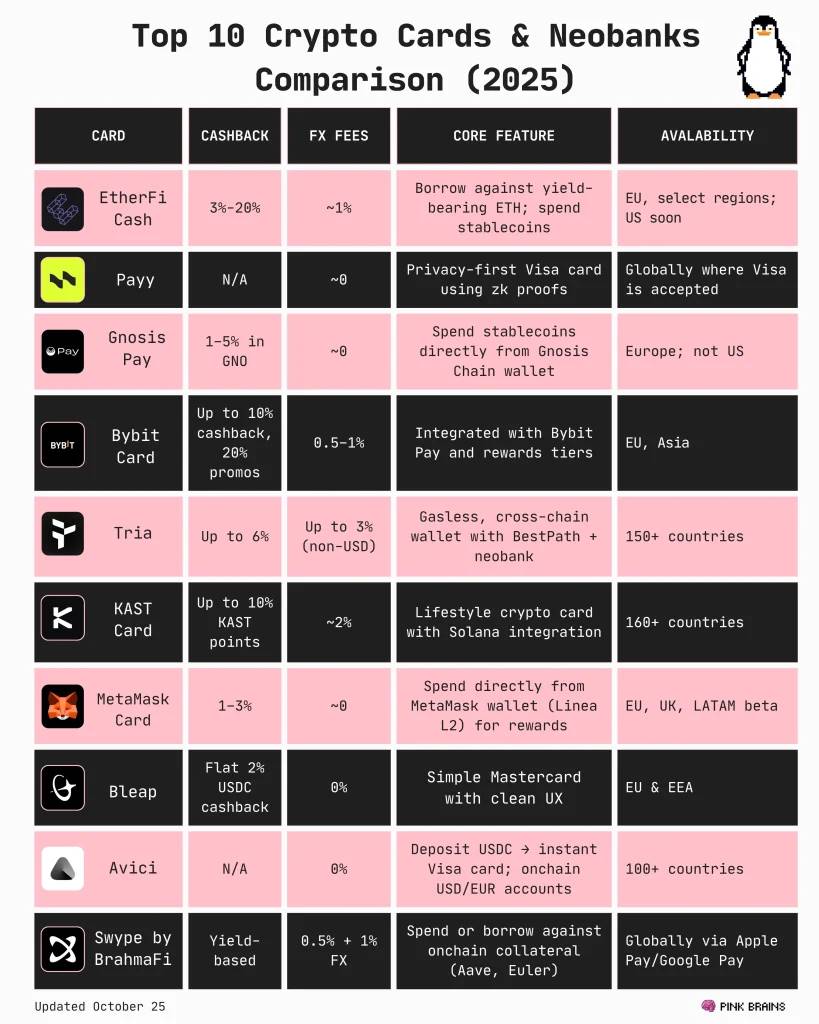 以下是基于托管模式、可用性、奖励机制以及现实实用性的2025年顶级加密卡和新型银行的对比清单。