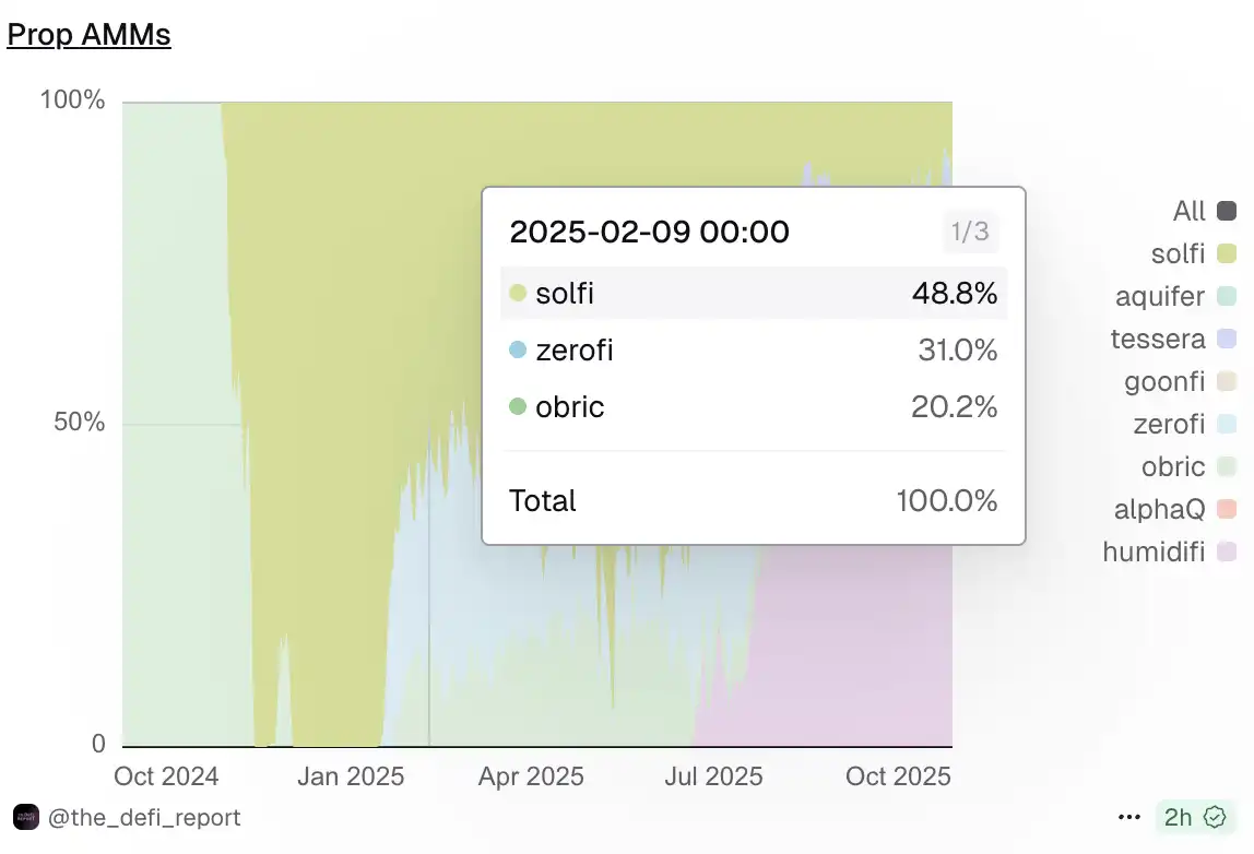 在 2025 年 2 月份,SolFi, ZeroFi 和 Obric 是主要的三个自营 AMMSource: Dune @the_defi_report