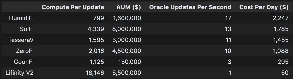 除此之外,HumidiFi 在成本控制方面也做的很好。HumidiFi 每天的运营成本仅为 2,247 美元。相比之下,SolFi 虽然管理的资金规模(AUM)是 HumidiFi 的 5 倍(80 亿美元 vs 16 亿美元),但每日成本仅比 HumidiFi 低 20%(1,785 美元)。