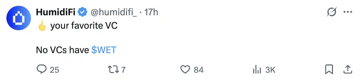 值得注意的是,HumidiFi 团队在 Twitter 上明确表示"没有 VC 份额",这在当前充斥着 VC 预售和低流通高 FDV 的市场环境中显得格外难得。