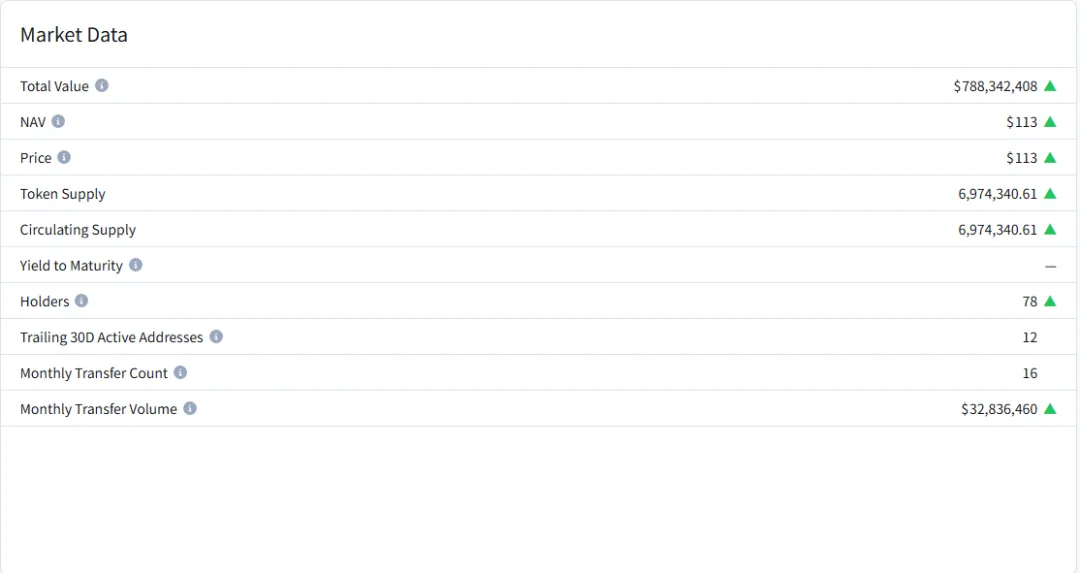 As of October 2025, the total asset value of OUSG is approximately $792 million, with a token net asset value (NAV) of about $113 per token. In the last 30 days, its secondary market monthly transfer volume is around $32.85 million, with a circulating supply of approximately 7,011,494 tokens, only about 79 holders, and around 12 active addresses. From this data, OUSG has already achieved scale effects and a compliant structure. However, at the same time, its secondary market activity is relatively low, with active addresses and the number of holders far below that of typical digital asset products, reflecting that its liquidity is still mainly concentrated among a few large holders or institutions.