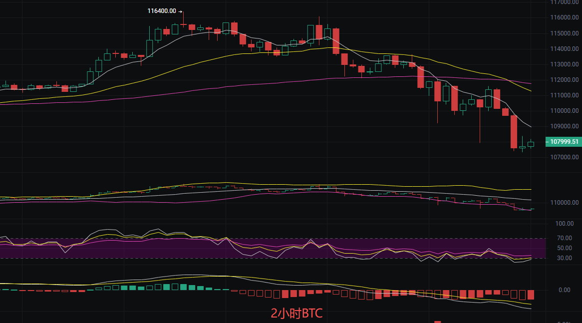 比特币现价107900,丽盈判断大饼综合明显的下跌趋势。技术面显示强烈的空头信号,K线形成看跌吞没形态,均线系统呈空头排列,近期出现死亡交叉,表明卖方主导市场动能增强。同时价格逼近关键支撑位106666,该位置若被跌破可能进一步加剧下行压力。日线连续下跌形成大阴线市场空头力量占优。2小时在108000附近出现震荡整理,短期内有止跌迹象,但整体仍处于下降趋势,MACD2小时空头动能减弱但尚未转强。EMA短期或有技术性反弹压力,长期趋势依旧偏空,思路上丽盈认为还是以逢高做空为主,低多为辅