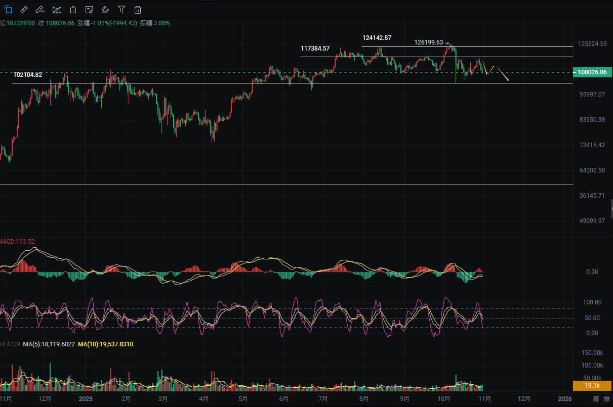 技术面目前来看的话,大饼日线级别显示近期走势持续下跌,形成多个阴线,整体呈现弱势格局。昨日的K线为长上影线,表明上方抛压较重。小时线级别中,价格在108000附近震荡整理,且低点逐步下移。技术指标MACD小时线处于负值区域,DIF和DEA均向下发散,动能柱缩小但仍为绿色,空头趋势明显。RSI小时线数值36.95,接近超卖区间,但尚未进入强反弹信号;日线RSI维持在40以下,市场情绪偏弱。EMA小时线7、30、120均线呈现空头排列,EMA7与当前价格相距较远,短期压力显著;日线EMA也呈现空头排列,EMA30对价格构成较大阻力。短期币价偏弱势不过临近关键支撑位附近,操作上日内可以反弹空为主,低位多为辅。