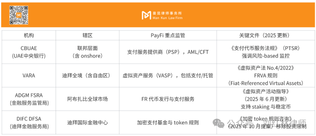 UAE的PayFi业务监管呈「分而治之」格局,四大支柱各司其职: