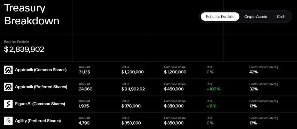 机器人投资 DAO。其治理代币 $DEUS 共计 3 轮的销售已经完成,共筹得了超过 550 万美元的加密资产。目前,该 DAO 已开始将拍卖所得用于支持 Apptronik、Figure AI 和 Agility Robotics 这三家公司都是人形机器人领域的企业。从官网的金库截图可以看到,DAO 的投资已经有开始实现盈利,甚至单笔的回报率超过了 100%。